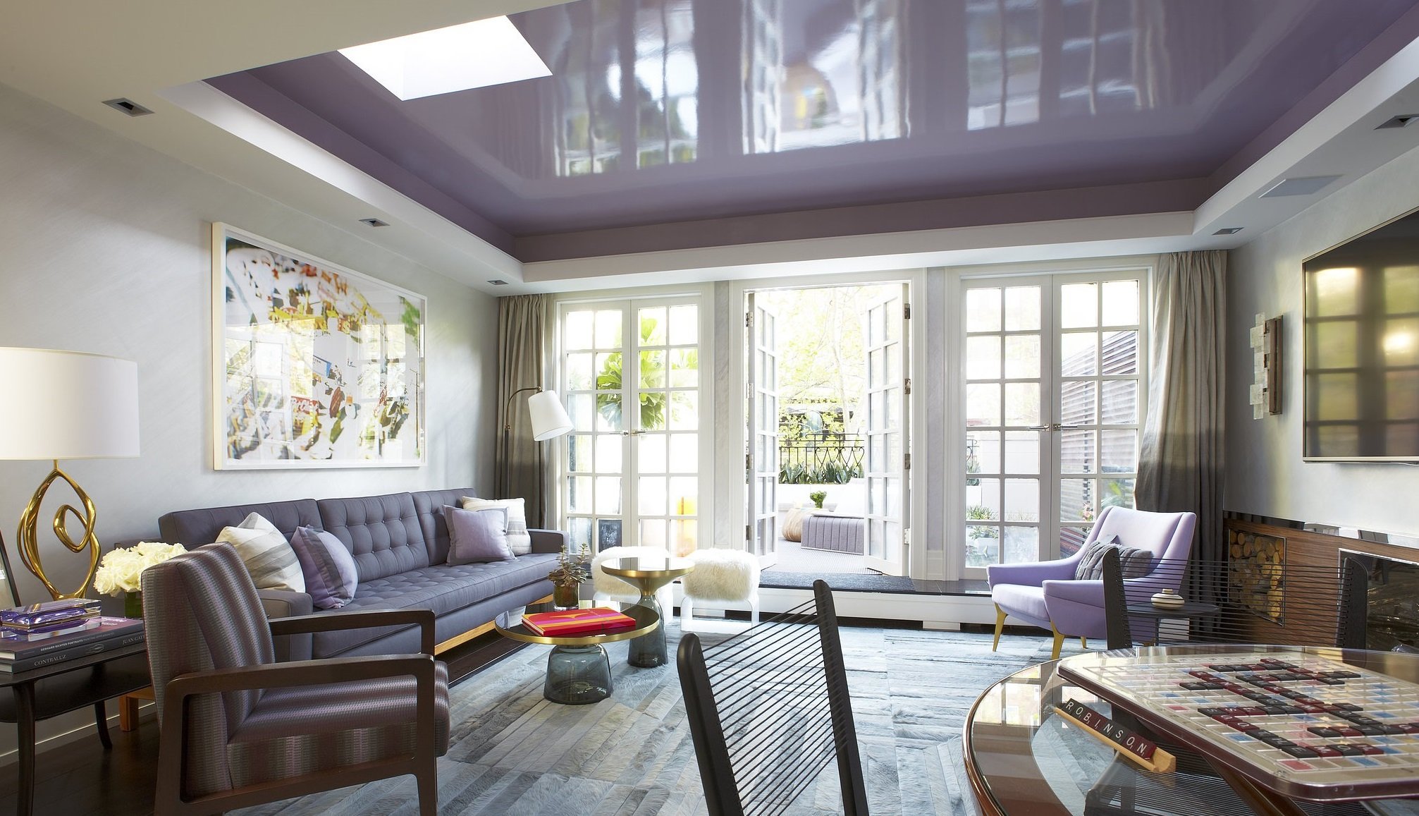 El techo debe estar pintado de blanco neutro. Esta opción clásica ayudará a ordenar la habitación y, al mismo tiempo, separará la parte superior unos centímetros. Si los propietarios prefieren las soluciones experimentales de diseño moderno, entonces debe adherirse a la regla de oro: el techo es más ligero que las paredes y, en ningún caso, viceversa.