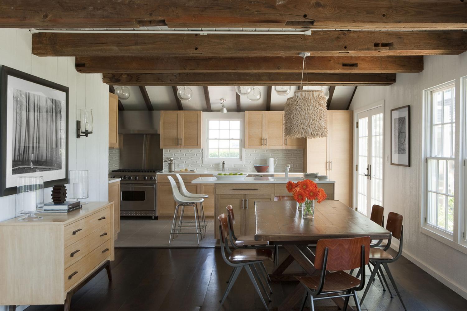 En el último caso, el ejemplo es doble. Las vigas de color marrón claro contra el fondo de un techo encalado pueden hacerlo más alto, pero solo si los pisos son muy delgados y limpios. Por cierto, esta solución es adecuada para fachwerk o chalet.