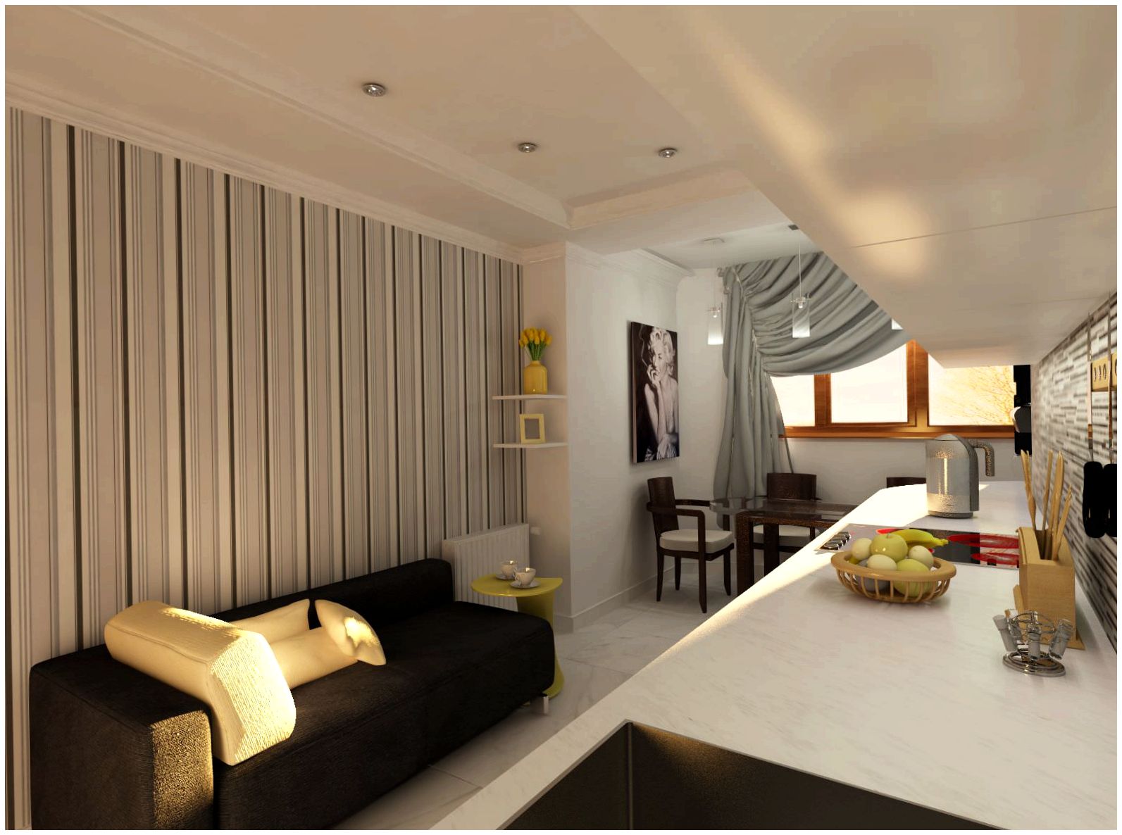 Además del juego de colores, usan combinaciones originales de fuentes de luz decorativas, pero hablaremos de esto un poco más adelante. Una solución inusual será el uso de recepción con diferencias de altura. No nos esconderemos, la opción es de naturaleza experimental e implica riesgos para empeorar todo. El podio está instalado en la sala. Parecería que tal diseño ciertamente tomaría centímetros adicionales, que ya son escasos. En parte, como es. La parte de la sala en la que está montado el podio realmente se convertirá en algo más mundano, pero la otra zona parecerá más alta, gracias a un ejemplo comparativo en el vecindario.