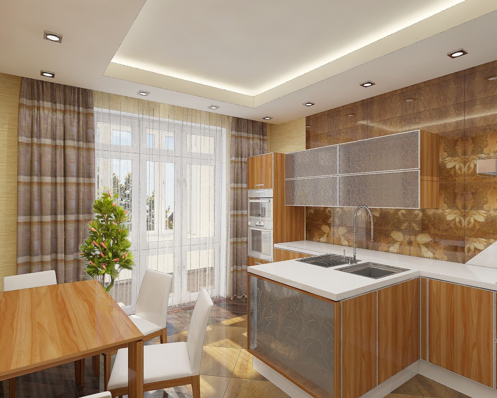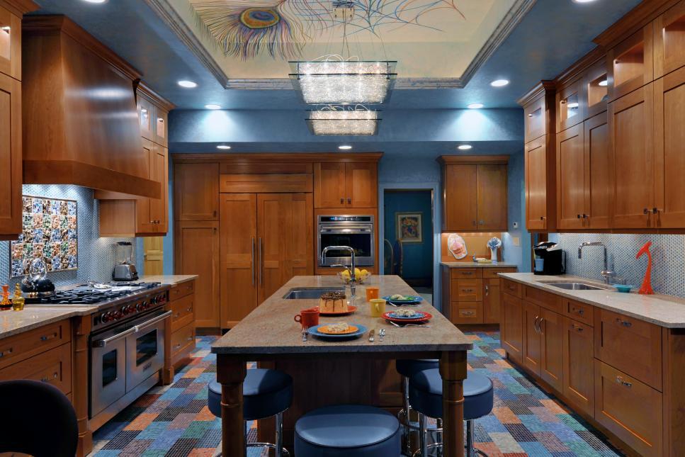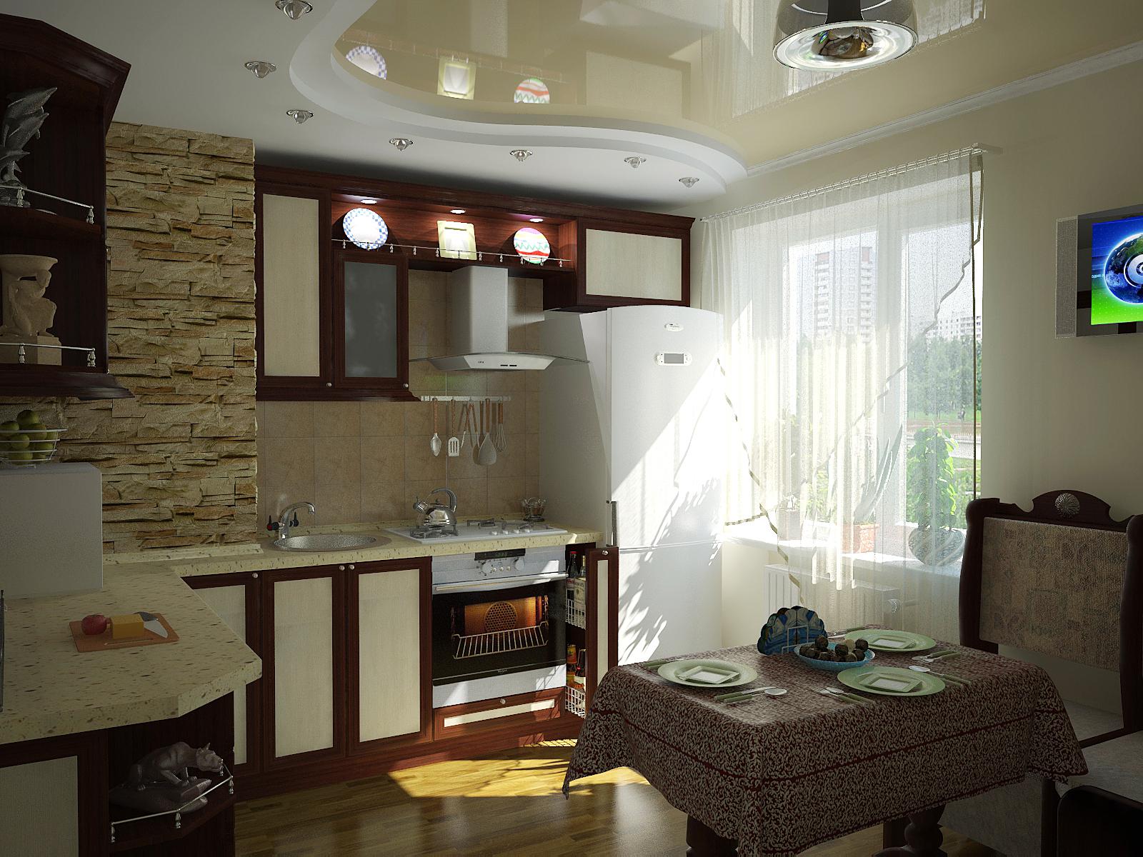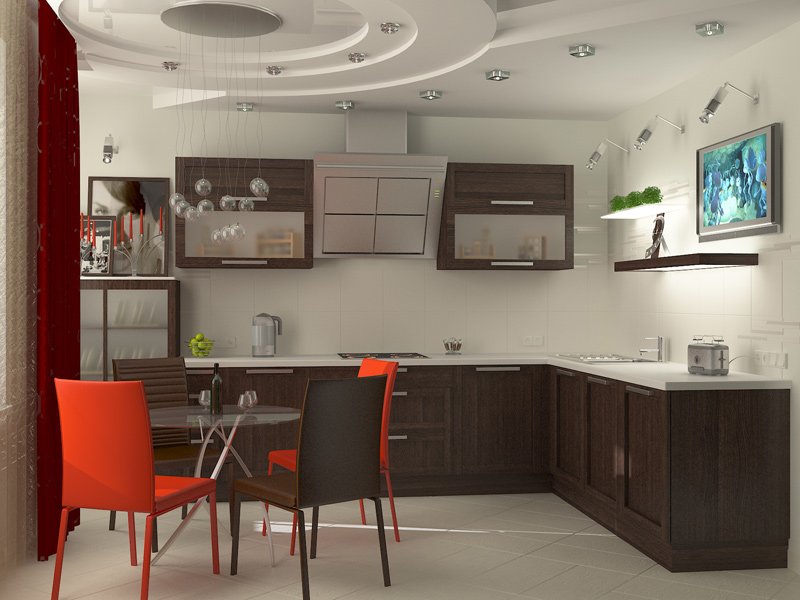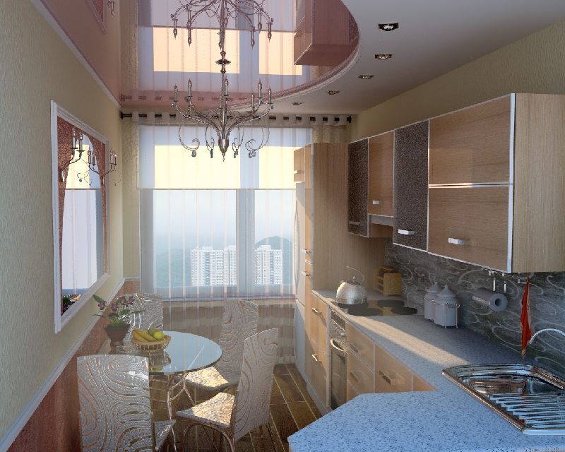 La cocina es una habitación importante en la que solo la anfitriona pasa la mitad de su tiempo libre.Las tareas de su hogar no deberían extenderse a un trabajo pesado, que puede evitarse completando un "estudio" con gusto. Si las dimensiones le permiten combinar la cocina con la sala o el comedor, entonces aquí toda la familia está constantemente presente "indirectamente". Las paredes están parcialmente cubiertas por muebles, los pisos están cubiertos con alfombras y el techo siempre está abierto a los ojos de los hogares y a la contaminación. Al desarrollar un proyecto de su diseño, construya no solo la belleza externa, sino también los términos de operación y la capacidad de soportar todas las pruebas del clima de la cocina.