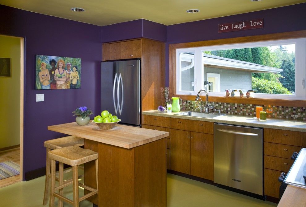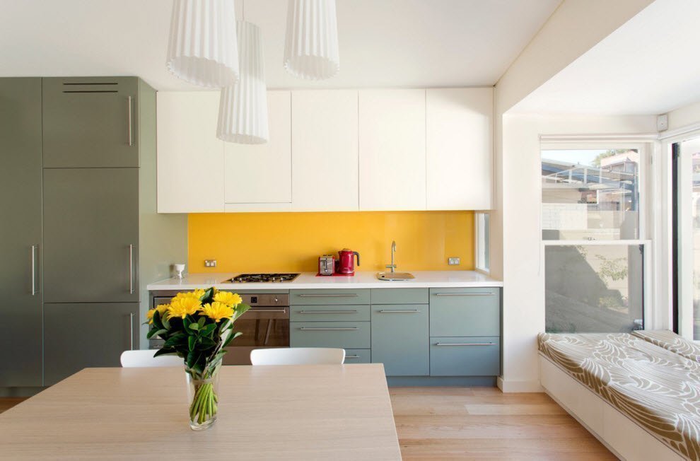 Al elegir un color, vale la pena centrarse principalmente en el tamaño de la habitación. Los tonos blancos y claros lo aumentarán visualmente, y el techo aparecerá más alto. El alargamiento adicional se realiza mediante papel tapiz "a rayas" o columnas decorativas, que tienden hacia arriba. Los colores oscuros aportan perspectiva. Se usan solo en grandes habitaciones combinadas. Vale la pena señalar que con la oscuridad debes tener cuidado en la cocina-comedor. Los científicos han demostrado durante mucho tiempo los efectos del color ambiental sobre el apetito humano. Se mejorará solo con tonos cálidos, "suaves", y tendrá que rechazar el oscuro, pero el frío (azul, gris). Presta atención a la abundancia de luz natural. Se usan tonos fríos en la cocina, que está bañada por la luz solar. En habitaciones privadas de una "atención" tan cálida, su déficit se compensa con naranja, amarillo y sus tonos.