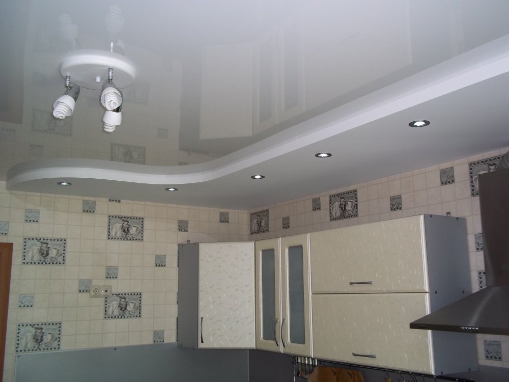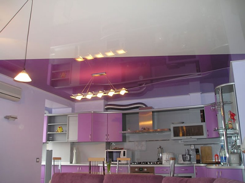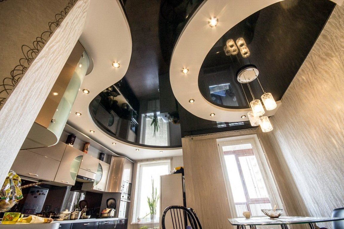 Al decorar el techo de la cocina-sala de estar o comedor, el borde de las áreas funcionales se enfatiza no solo con colores y luz, sino también con materiales con diferentes texturas. Los paneles de yeso, plástico, madera y lona elástica de vinilo se pueden combinar entre sí. Cualquiera de estos materiales se combinan, si se acerca a la selección de texturas y colores sabiamente."Dueto" con una mano ligera se convertirá en el punto culminante de la sala, desde el cual los invitados no quitarán la vista. No exagere e involucre en el experimento más de dos tipos de materiales completamente diferentes. Los contrastes ásperos a menudo estropean el diseño.