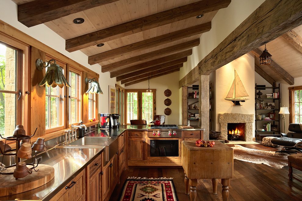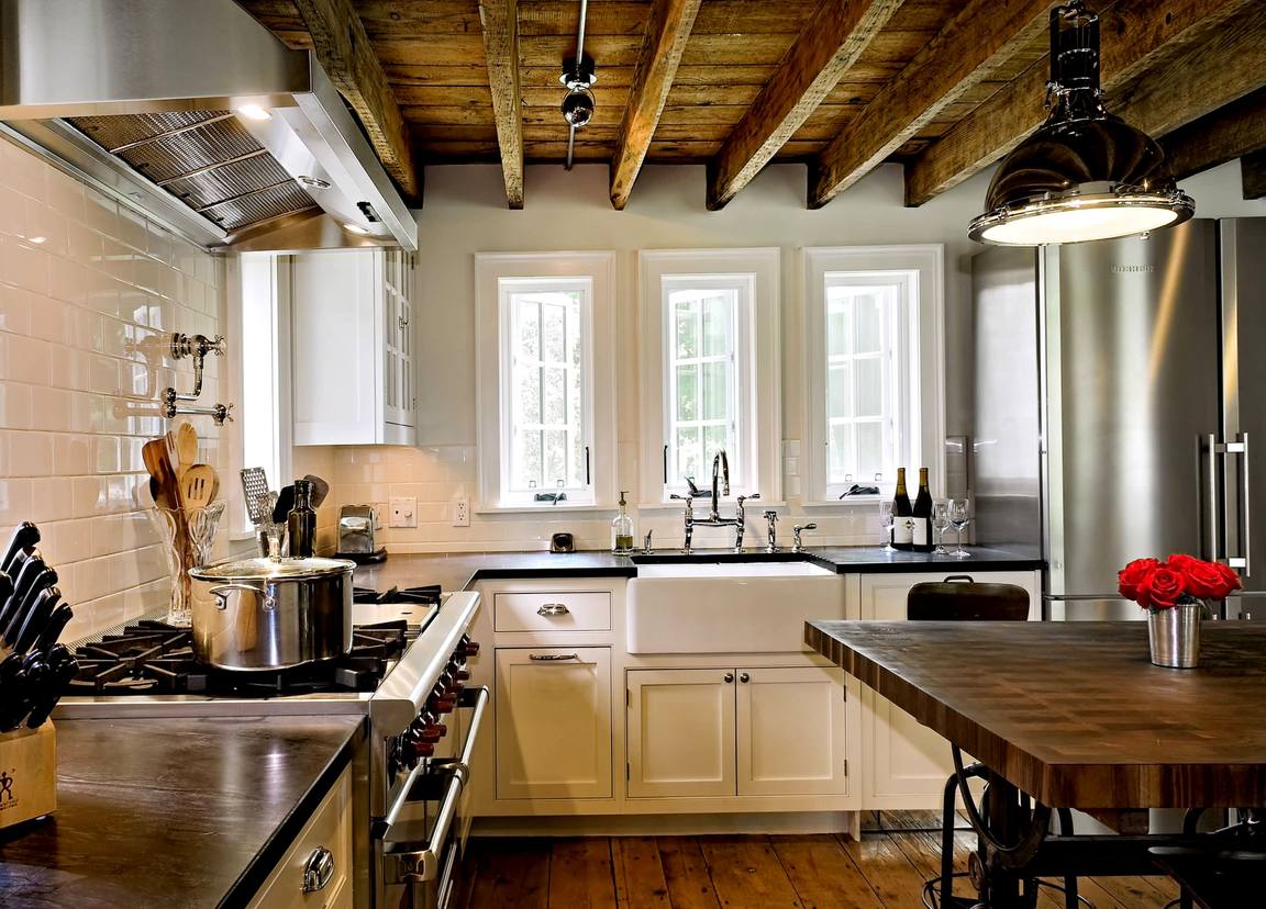 Las vigas y las vigas falsas también son populares en los estilos country, provenzal, rústico o étnico. Decoran los techos no solo en las cocinas de casas de campo privadas, sino también en modernos apartamentos o pequeños Jruschovs.