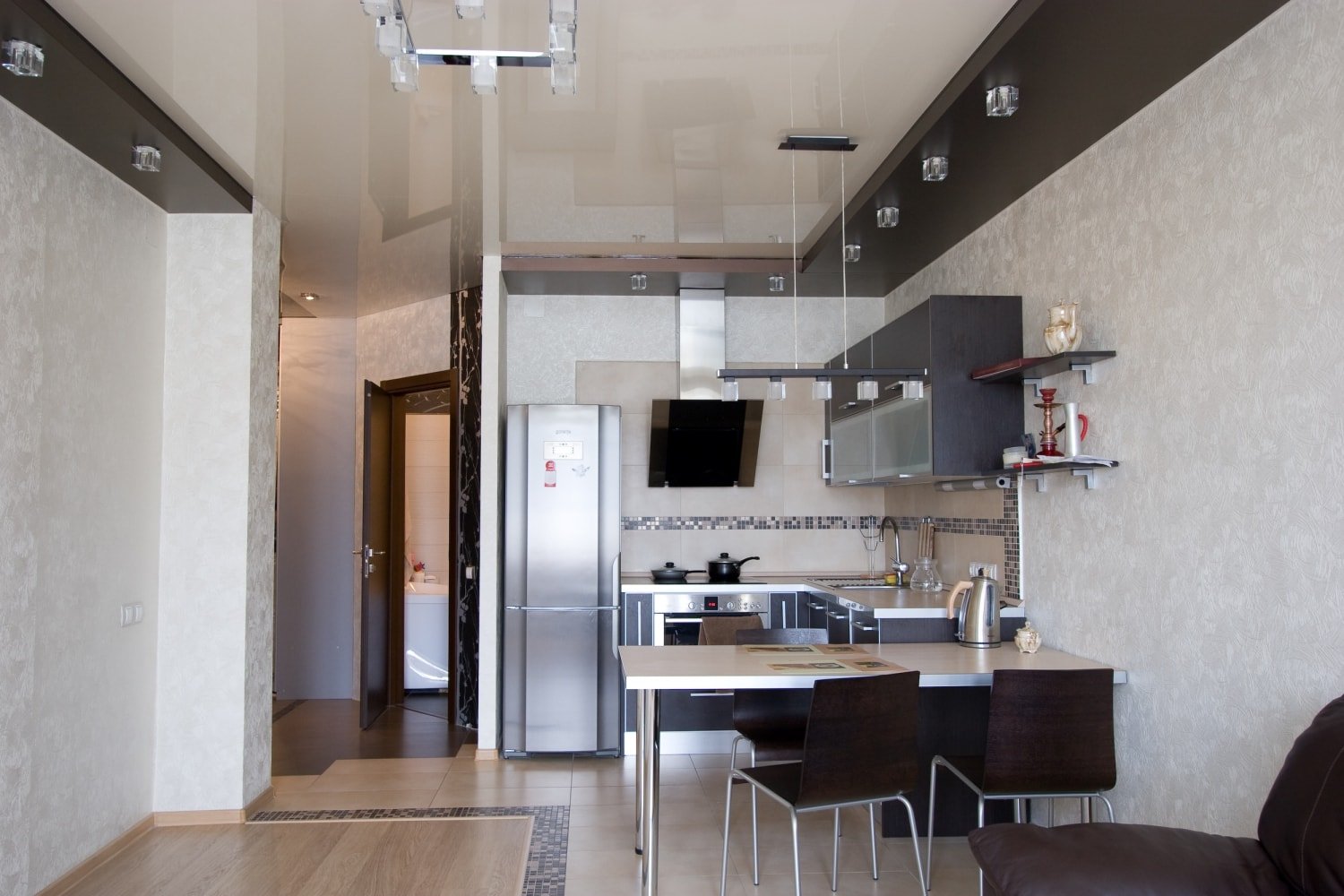 La cocina es un mundo especial y pequeño de la anfitriona en el universo de la casa. Aromas únicos de platos se ciernen aquí, la familia se reúne aquí por la mañana para tomar una taza de café y huevos revueltos, a los invitados aquí les gusta sentarse a tomar una taza de té. Ninguna otra habitación en el apartamento tiene un microclima como en la cocina. Fluctuaciones constantes de humedad y temperatura, acumulación de aromas y subproductos de la cocina. Debido a estas características, los requisitos para el diseño del techo, las paredes y el piso también son únicos. Antes de comenzar las reparaciones, piensan en todos los matices y detalles para que el resultado no solo sea práctico, sino también duradero. La "caja" de la habitación: paredes, piso, techo, no se puede cambiar cada dos años, como se puede hacer con los muebles.