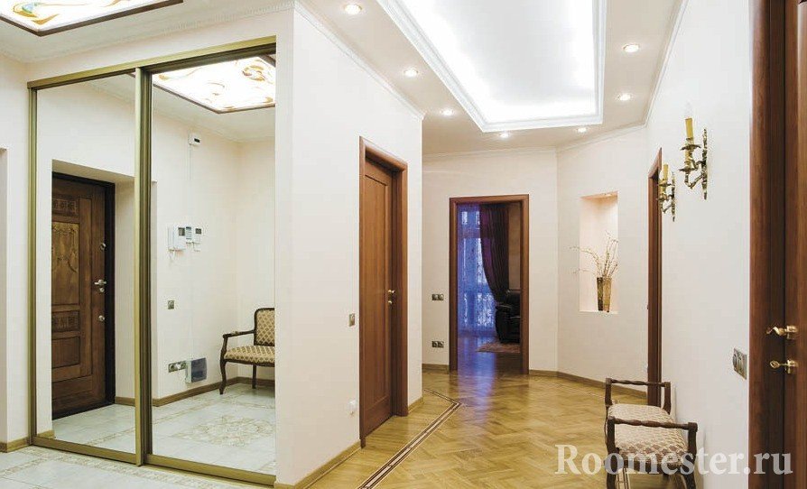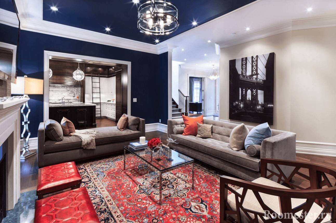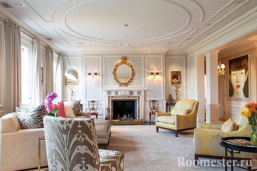 Usar un color mate para la decoración de paredes y techos no es una buena idea. Para que la habitación no se fusione, es necesario distinguir entre transiciones entre planos con relieve o inserciones de otros colores y materiales.