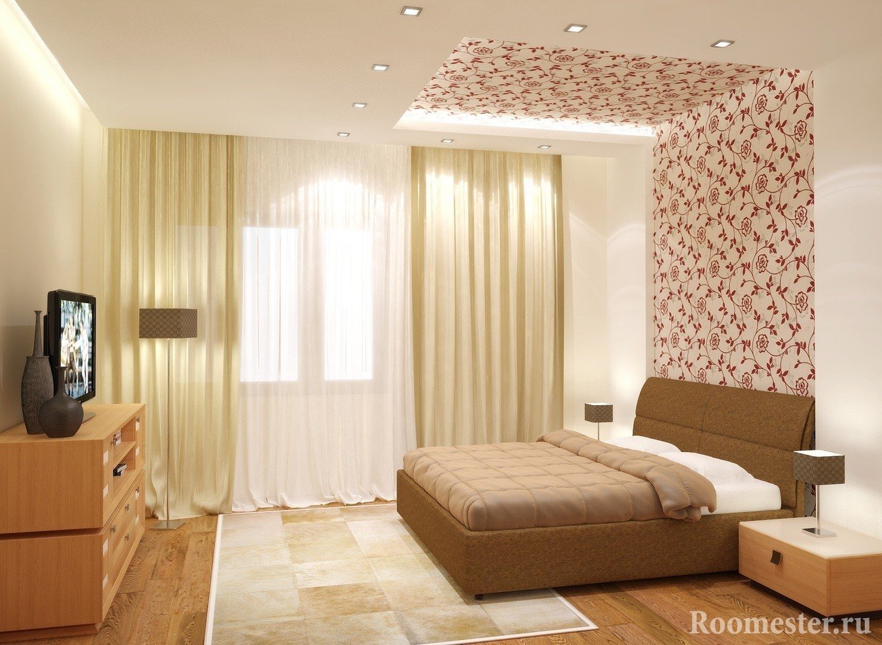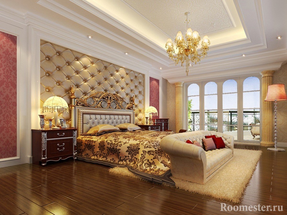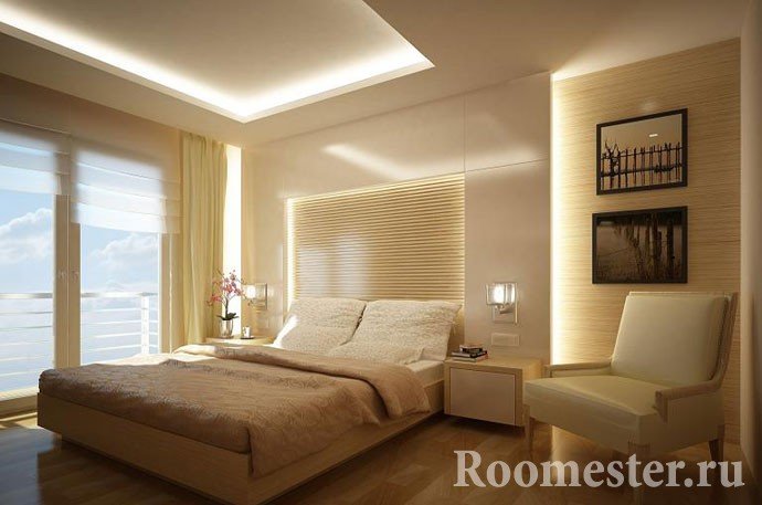 Para el dormitorio, los tonos claros y tranquilos y los clásicos elásticos serán la mejor opción. La superficie no debe enfocarse en sí misma e interferir con la relajación. Las superposiciones de marfil brillante o champán son buenas.