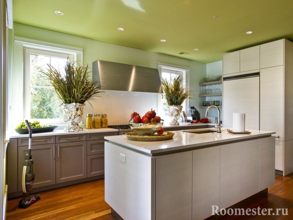El techo blanco es el habitual, pero lejos de ser el único esquema de color posible para la habitación. Al elegir un color, debe combinarse correctamente con el diseño de las paredes y también tener en cuenta las características de la habitación, que puede afectar visualmente.