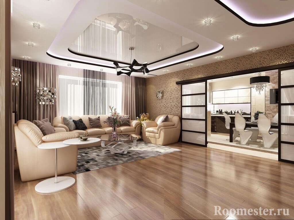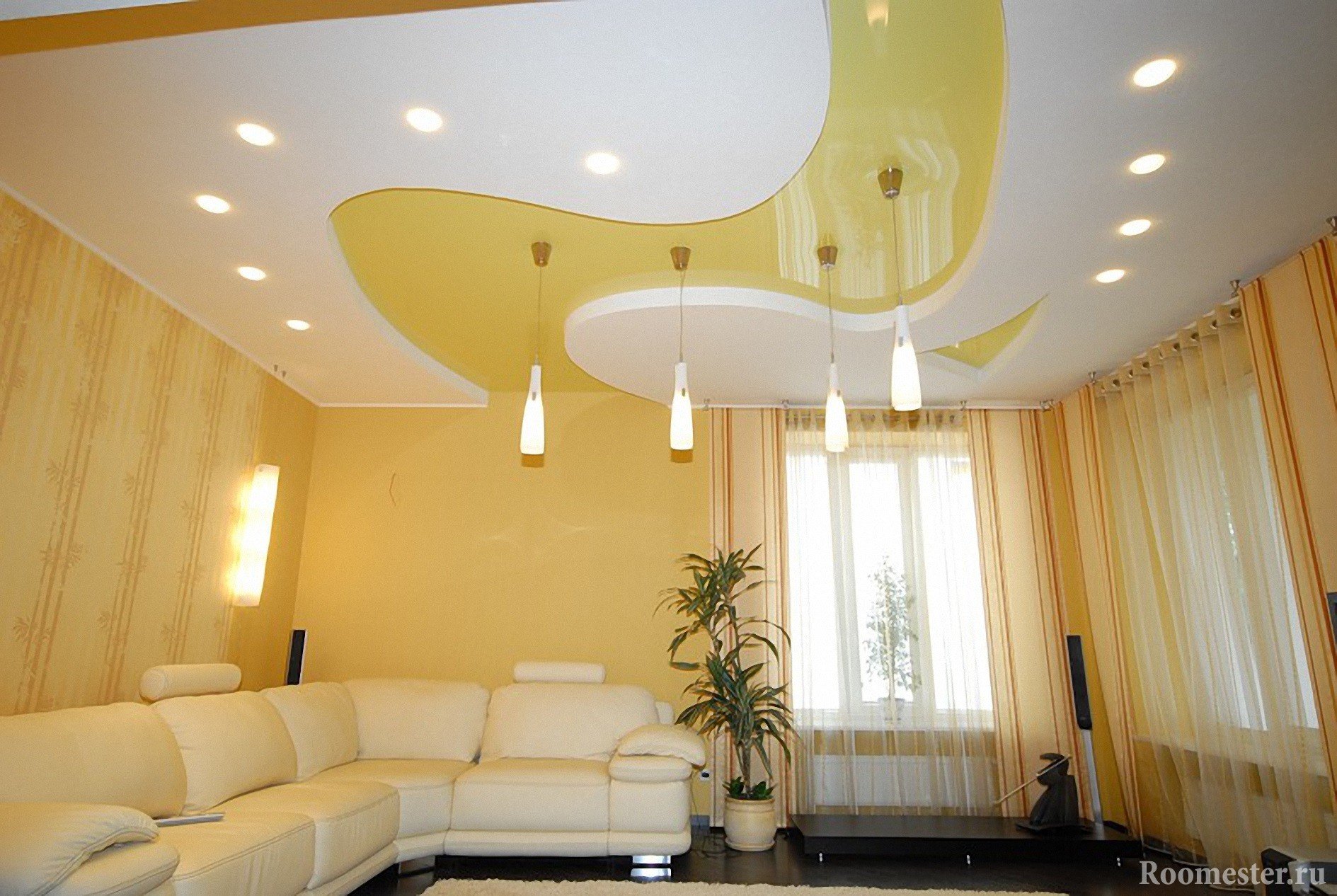 El diseño del techo de pladur en la sala de estar puede ser absolutamente cualquier cosa. Es importante mostrar imaginación. Lo principal es combinarlo correctamente con el interior de la habitación. Un diseño de varios niveles o un espejo para colgar son adecuados. Es importante proporcionar varias opciones para iluminarlo: desde una brillante que llene todo el espacio, hasta una pequeña luz de fondo para mirar televisión.