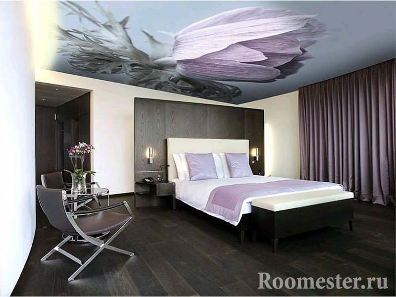 Al elegir un esquema de color para un dormitorio, no debe experimentar con colores brillantes. Este lugar está destinado principalmente a la recreación. Varios tonos de leche, así como rosa pálido, púrpura, servirán.Una solución original tanto para el dormitorio como para la habitación de los niños puede ser un techo con el efecto de un cielo estrellado.