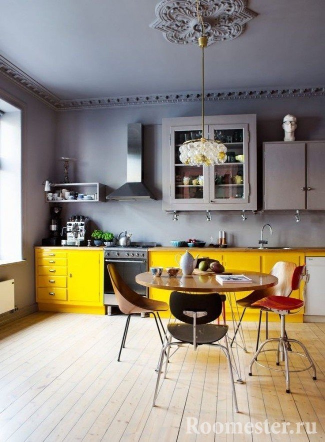 El piso de la cocina debe ser brillante y expresivo, vigorizante al comienzo del día y energizante. Los científicos han demostrado que los colores brillantes mejoran el apetito y aceleran el metabolismo. Absolutamente no apto para las opciones de cocina para empapelar o paneles.
