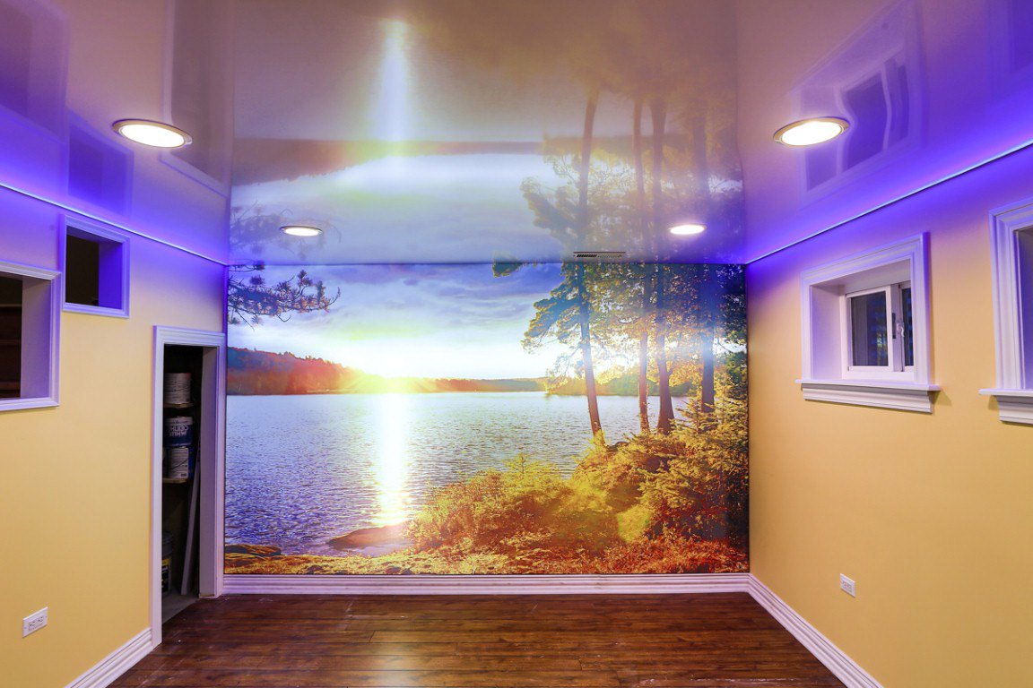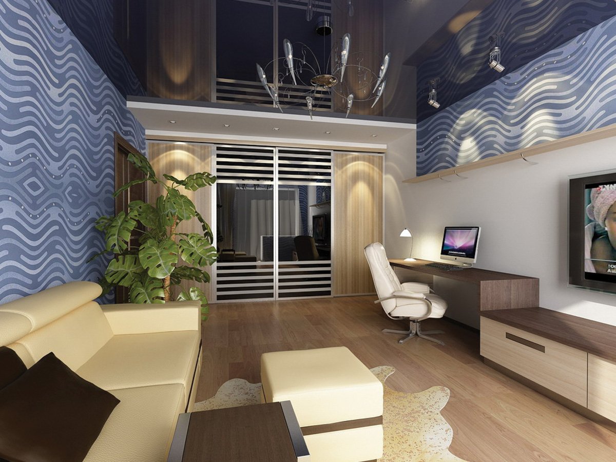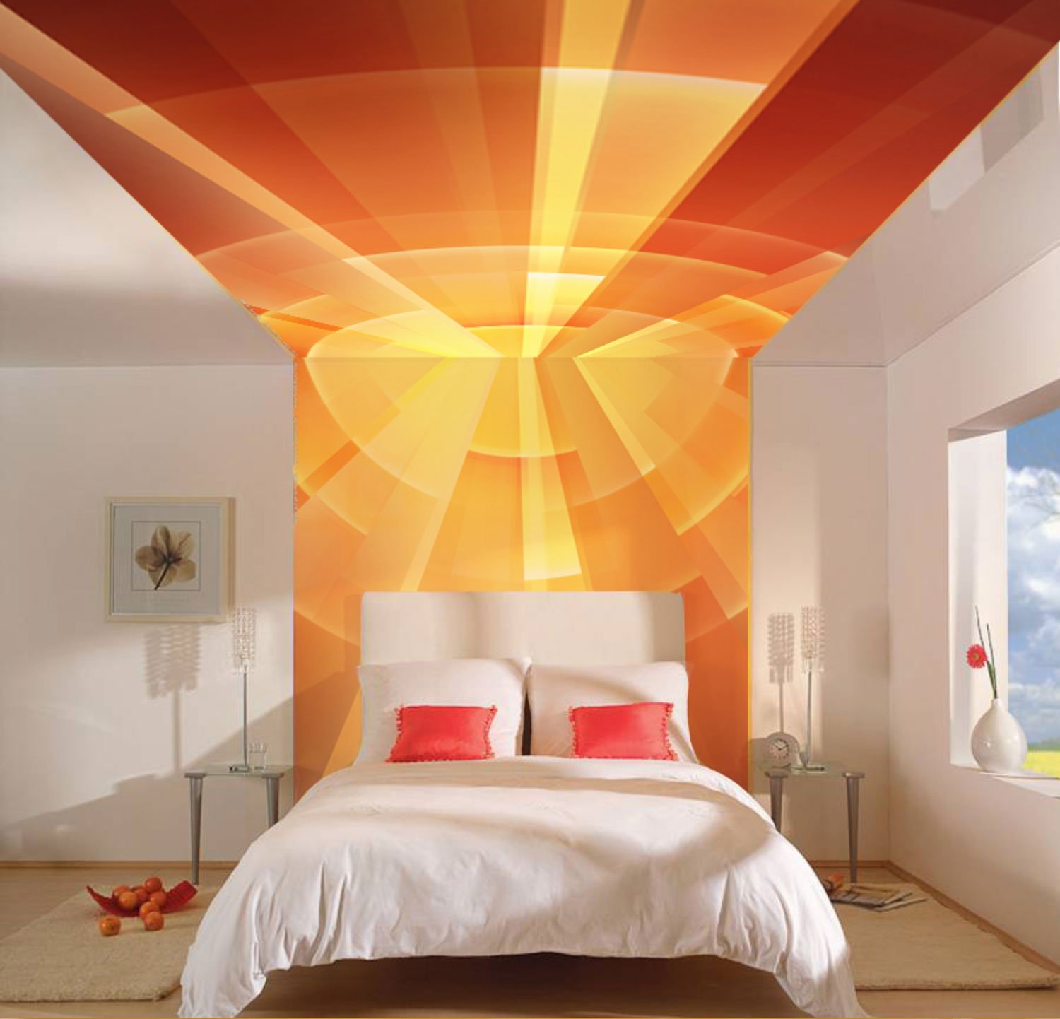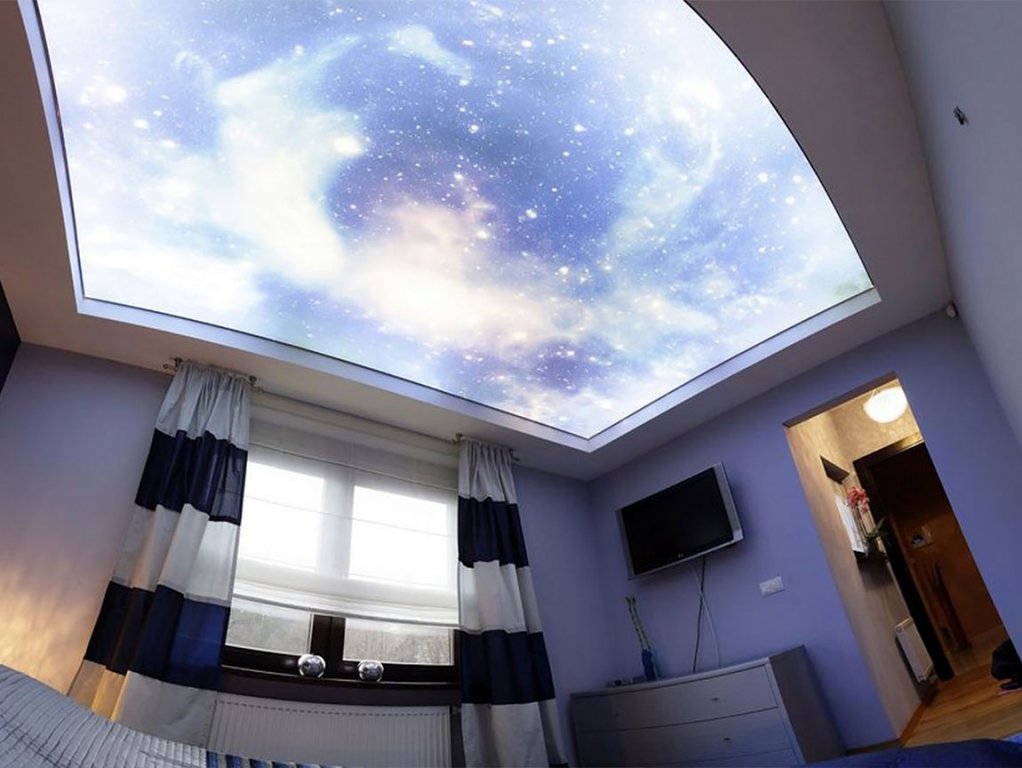Para amplias salas de estar, dormitorios, habitaciones infantiles con ventanas panorámicas hacia el lado sur, lienzos mate en varios niveles, colores fríos y saturados son adecuados. Una habitación estrecha con una sola ventana hacia el norte está decorada con un lienzo ligero, cálido y brillante en un nivel.