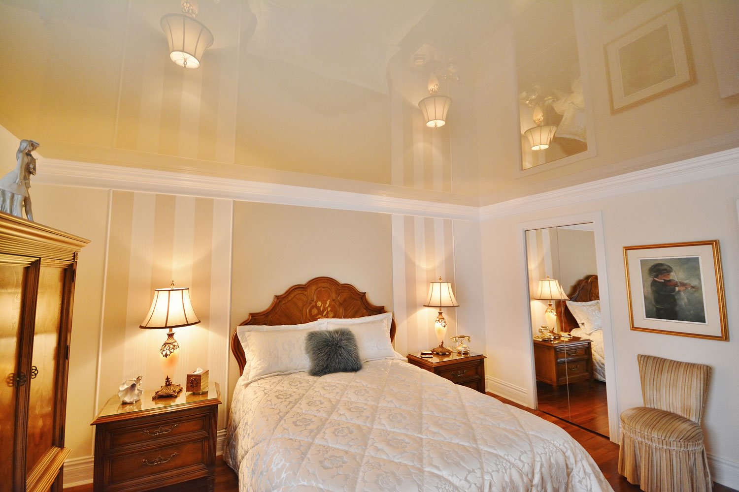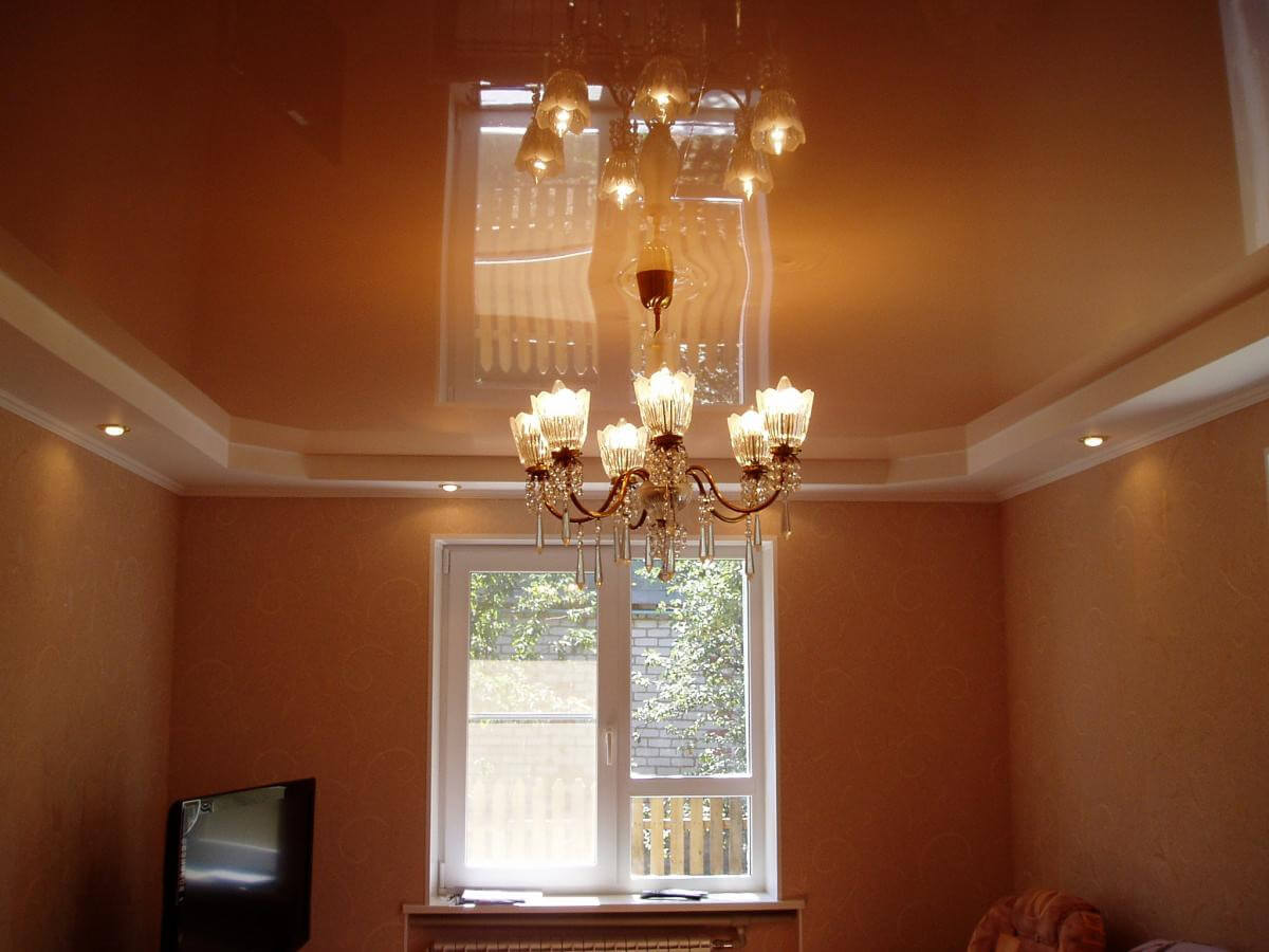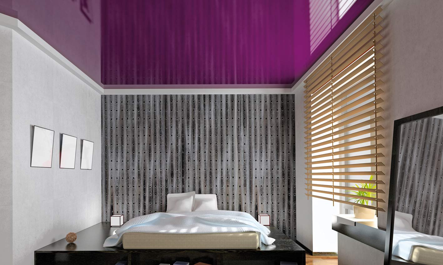 Brillante, refleja fácilmente los rayos de luz, da mucho brillo, expande el espacio estrecho, lo hace más alto.Tal lienzo, especialmente blanco, beige, llena la habitación de luz, pero si está en exceso aquí, entonces los ojos estarán muy cansados. En las habitaciones sin calefacción de una casa de campo, no debe montarse: durante el invierno, el revestimiento quedará inutilizable.