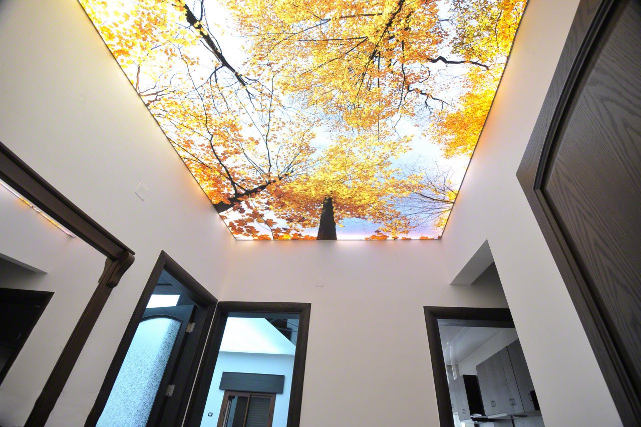 El revestimiento tiene una textura interesante que conserva el brillo de los textiles naturales. Protege perfectamente contra fugas de agua, parcialmente de vecinos ruidosos desde arriba. No tiene costuras, está hecho de material textil-polímero que proporciona procesos normales de intercambio de aire en la habitación. Se puede realizar de forma translúcida e interesante dispersando la luz. No cede, resistente a bajas temperaturas.