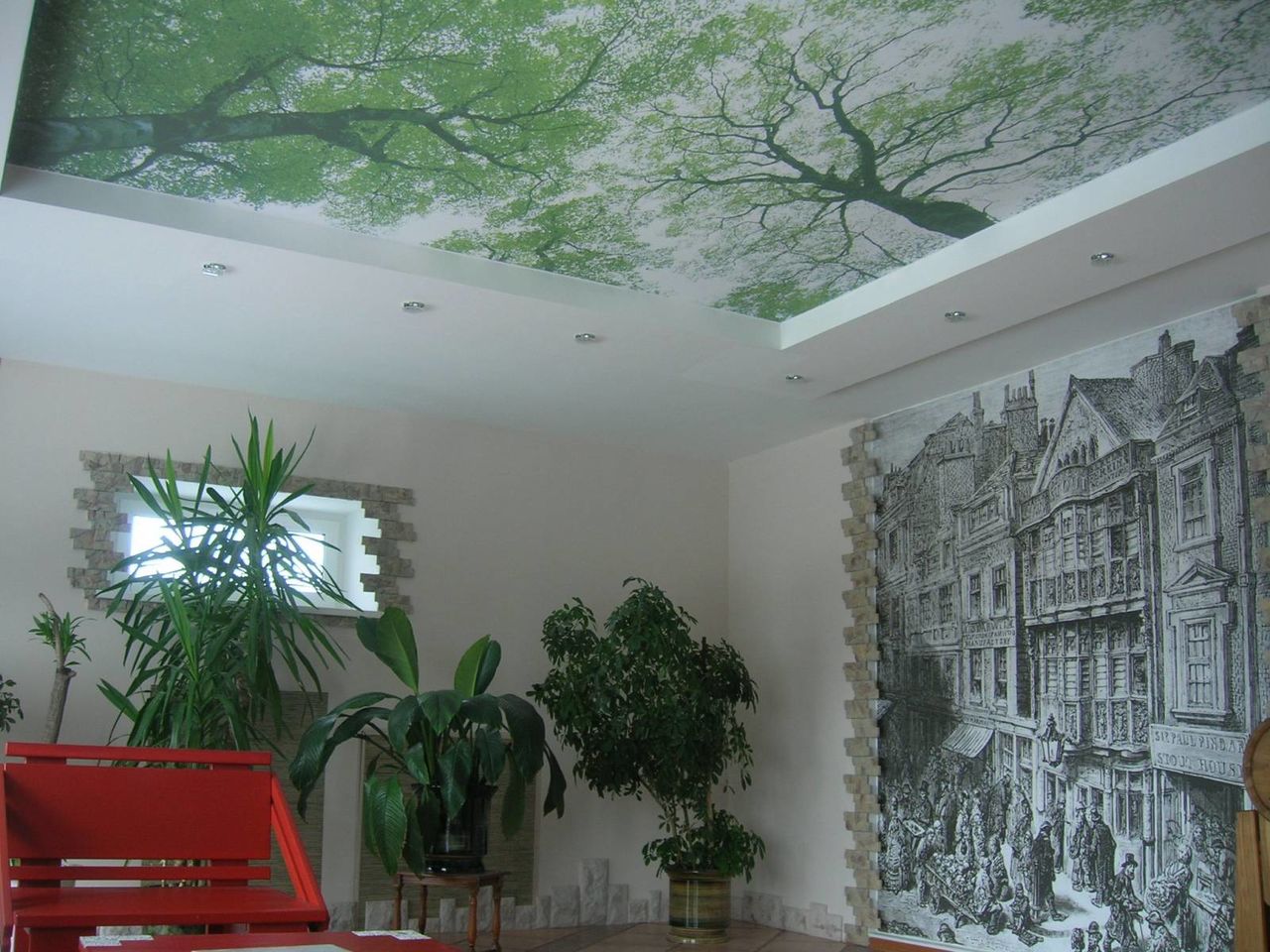 Se utilizan diferentes motivos en diferentes habitaciones: para la cocina, son adecuadas imágenes con frutas, granos de café, mariposas y hojas. El pasillo, el dormitorio, el pasillo estarán decorados con imágenes de palmeras, pinos, como si cerraran coronas sobre su cabeza, adornos simétricos o espirales, abstracciones. Los delfines que nadan, los peces extravagantes entre los corales, la imitación del sol que brilla a través de la columna de agua se ven bien en el baño.La guardería está compuesta por parcelas espaciales, nubes delicadas, tramas de cuentos de hadas, lindos animalitos.