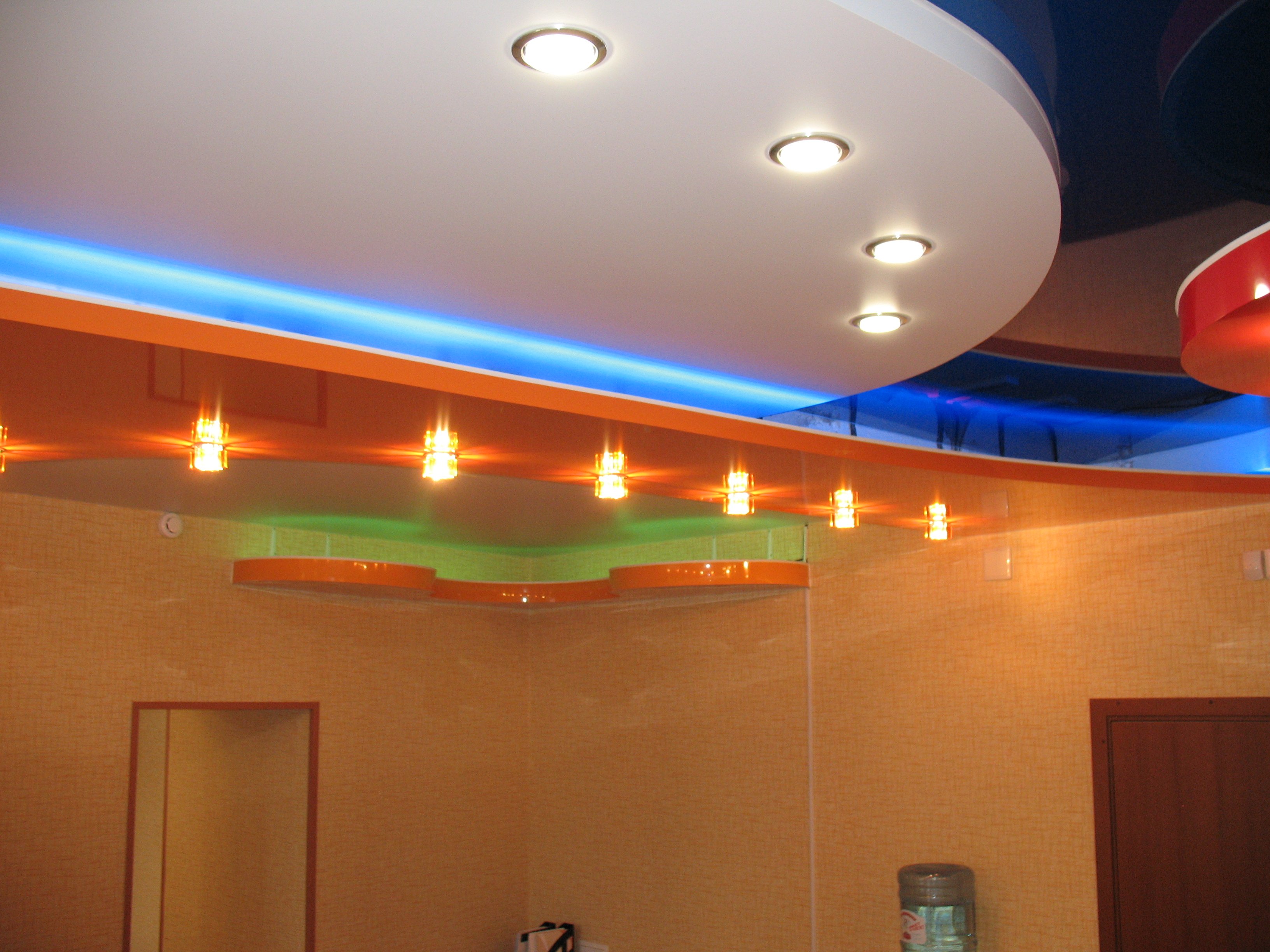 bombillas en el interior: un plano retroiluminado ubicado detrás de techos de varios colores crea una zonificación del espacio con la ayuda del color, la iluminación difusa y tranquila;