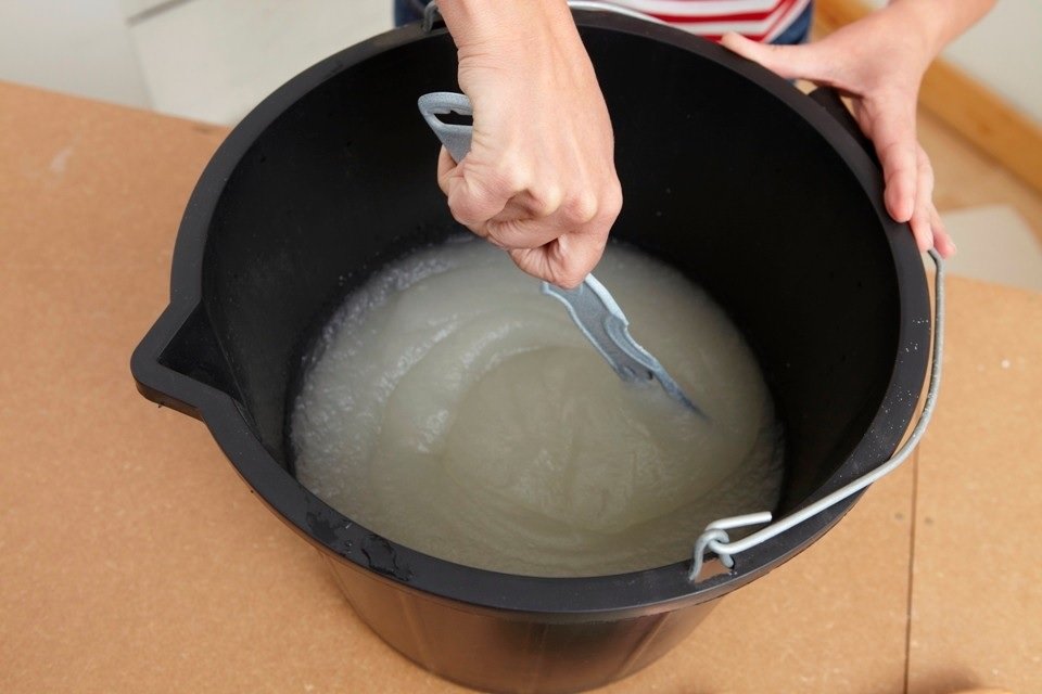 Añadir agua Consumo aproximado de 3 litros por 1 kg de la mezcla. Es necesario verter agua gradualmente, mezclando constantemente, hasta que el material en consistencia parezca una crema agria líquida;
