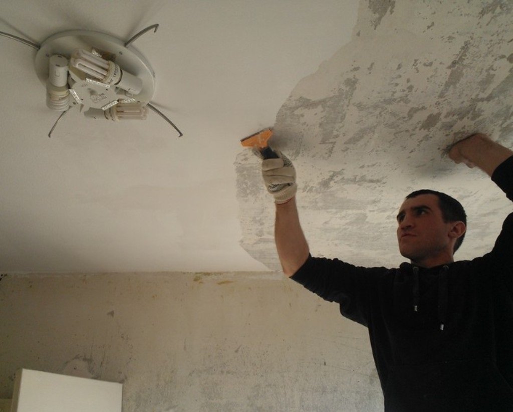 Antes de pintar, es necesario preparar la superficie. Tal proceso puede tomar mucho más tiempo y esfuerzo que mancharse. Primero debe evaluar el material del techo y su estado. Si la base está hecha de concreto, cierre todas las grietas y aplique una imprimación. También deberá alinear todas las costuras entre las placas. Las superficies de madera se lijan antes de aplicar la capa intermedia de tierra, las juntas entre las láminas se ponen masilla en paneles de yeso. Para eliminar el revestimiento antiguo y aplicar uno nuevo, debe abastecerse con la herramienta necesaria.
