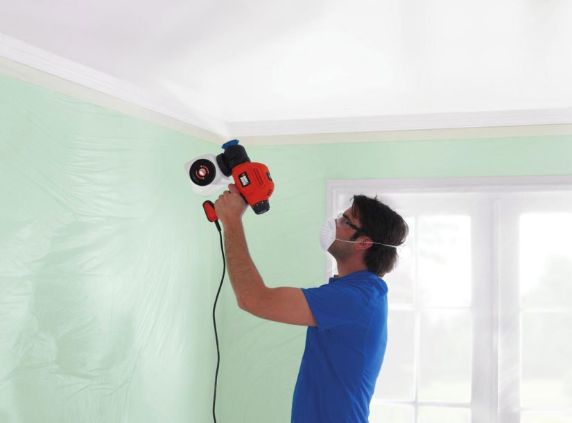 Una pistola pulverizadora u otra máquina se utiliza mejor para pintar habitaciones grandes. Aumenta significativamente la productividad laboral, le permite distribuir la pintura en el techo con una capa delgada y uniforme. No se forman manchas en la superficie, y si aparecen gotas caídas, se limpian fácilmente con una esponja. A diferencia del rodillo y la brocha, el atomizador puede reducir significativamente el consumo de material, lo que reduce el costo final de la pintura.