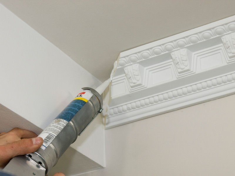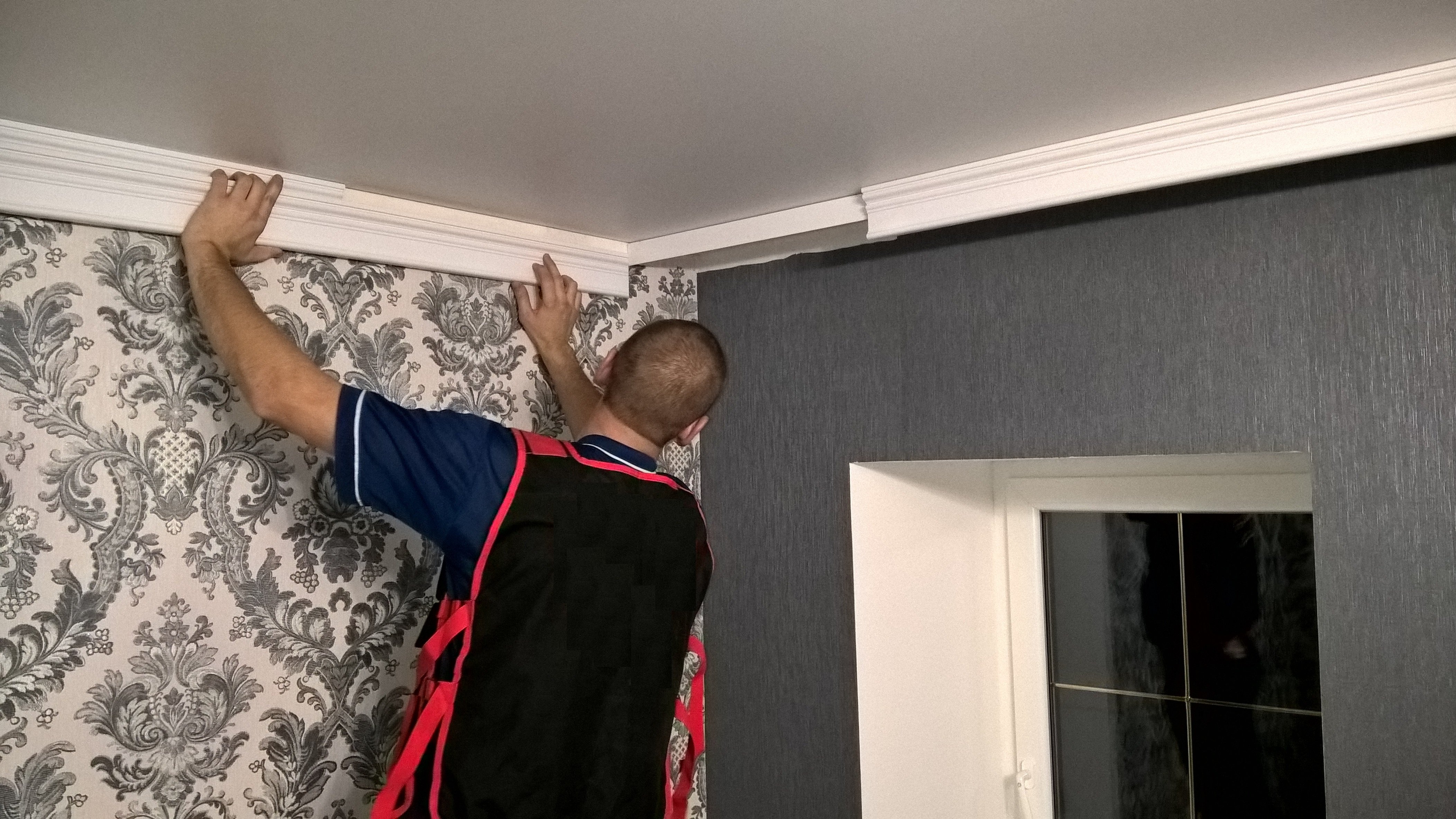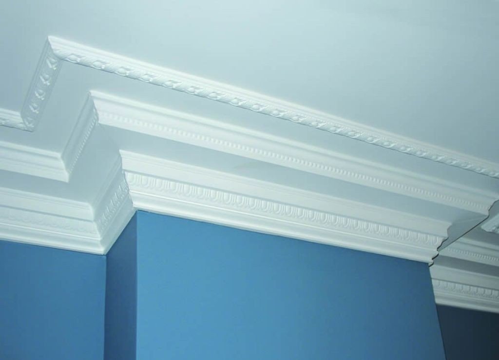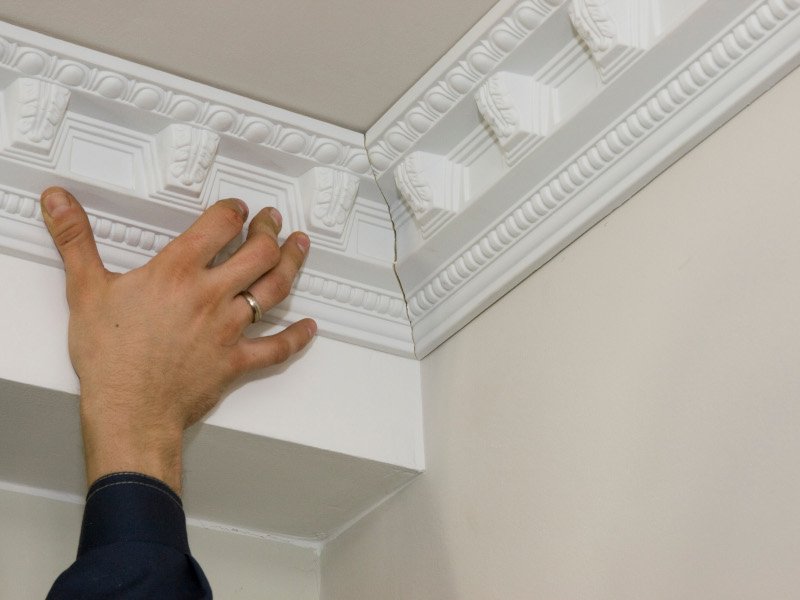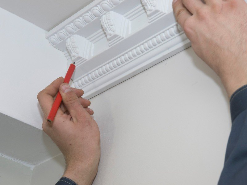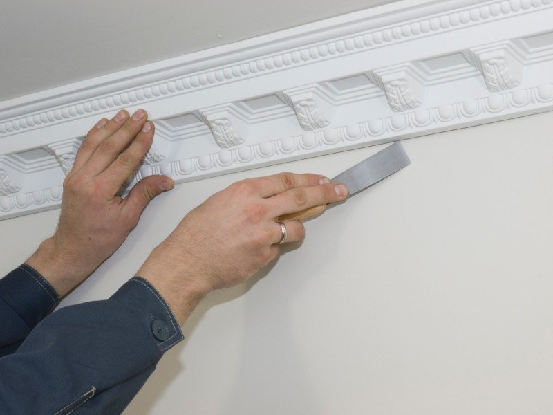 Para cortar dicho material, es necesario abastecerse con una sierra ingletadora. Las cornisas pesadas de gran formato se deben fijar adicionalmente con tornillos autorroscantes, cuyos sombreros se untan posteriormente con masilla o pintura no agresiva del color de la cornisa.