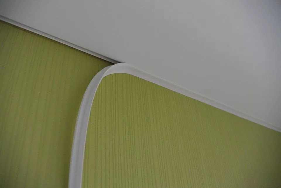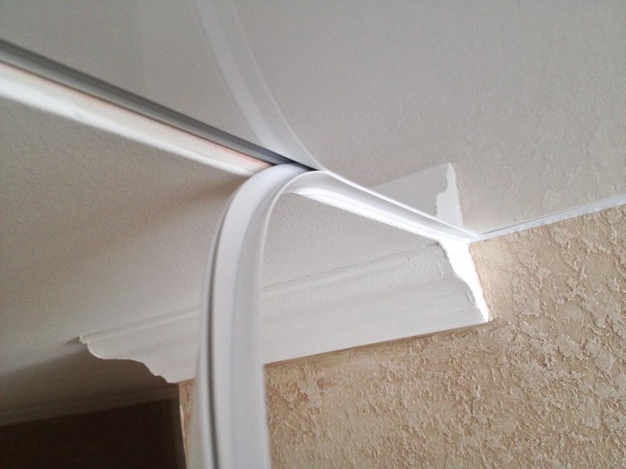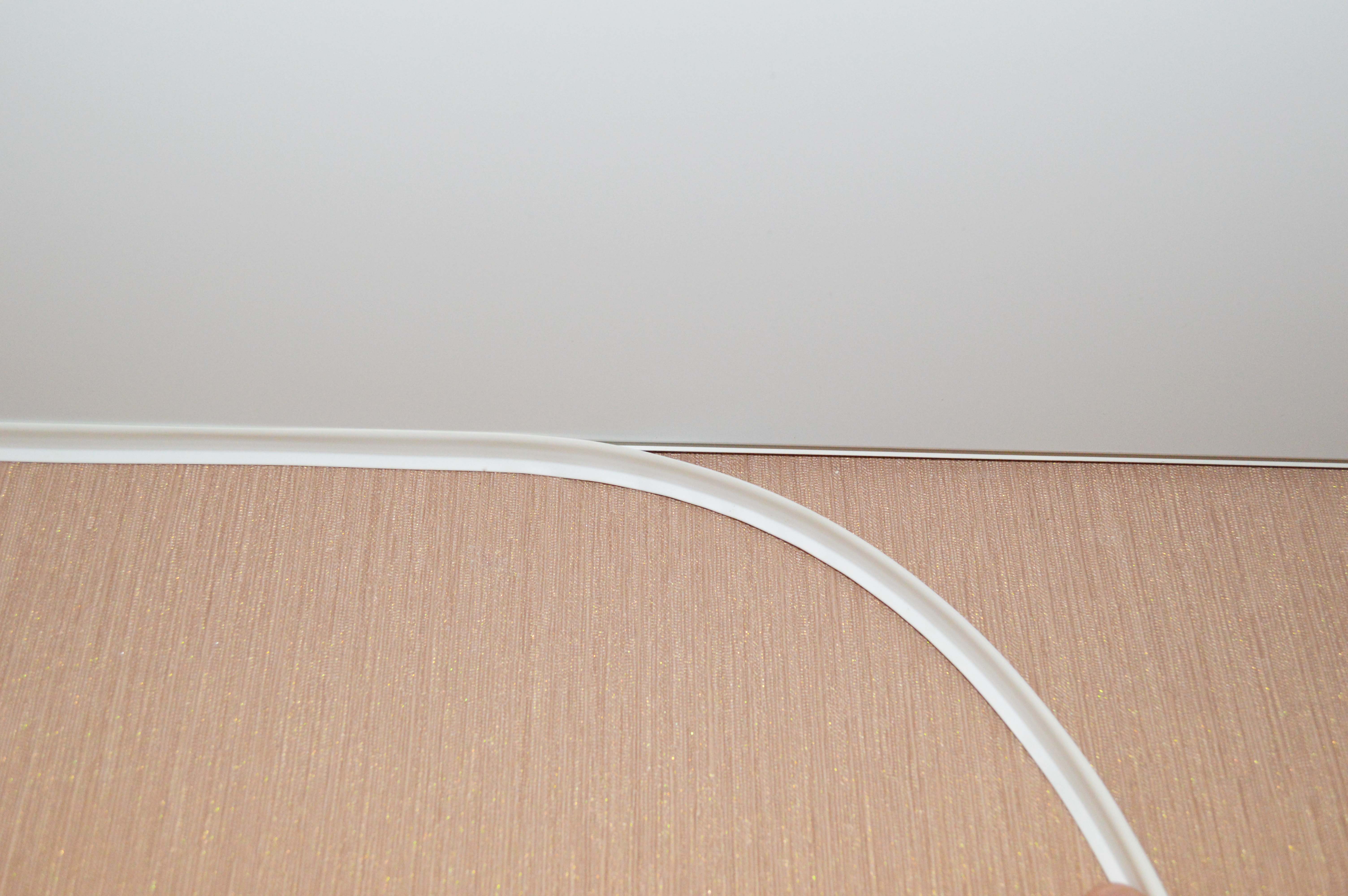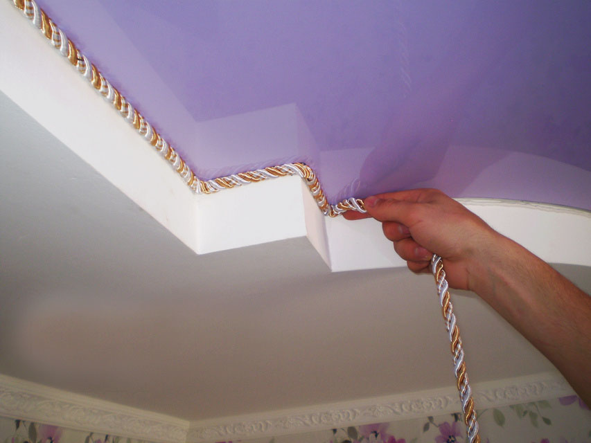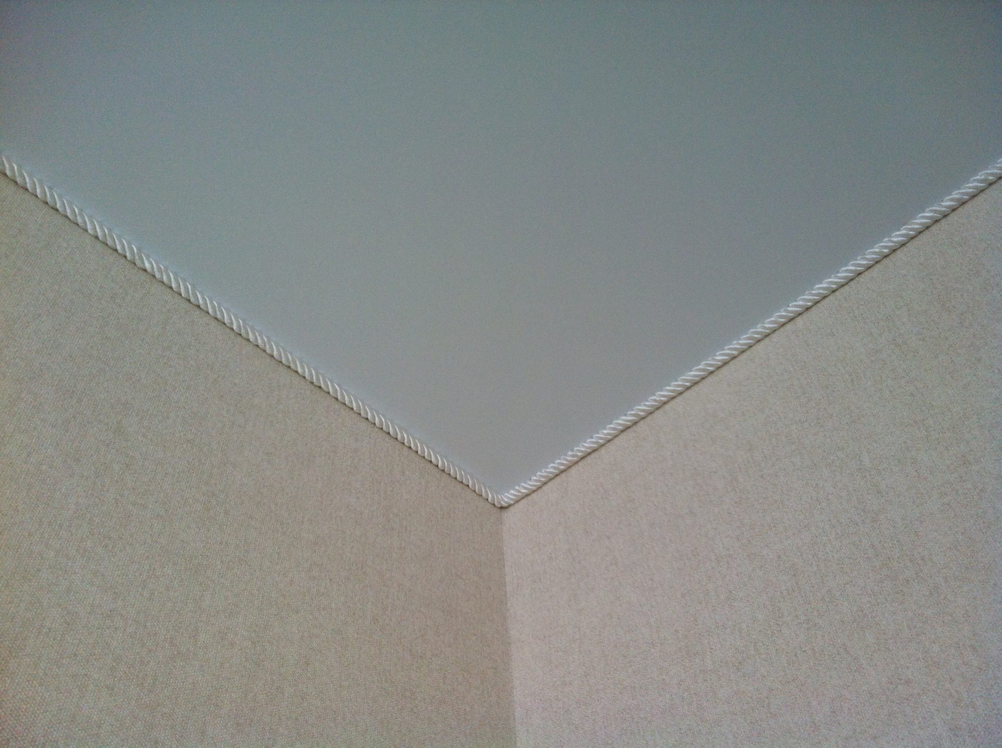 Después de instalar la red de tensión entre la pared y el perfil, queda un espacio. Parece poco estético, por lo que la abertura resultante debe estar cerrada. Para completar y completar la composición, use un zócalo de techo para falsos techos.