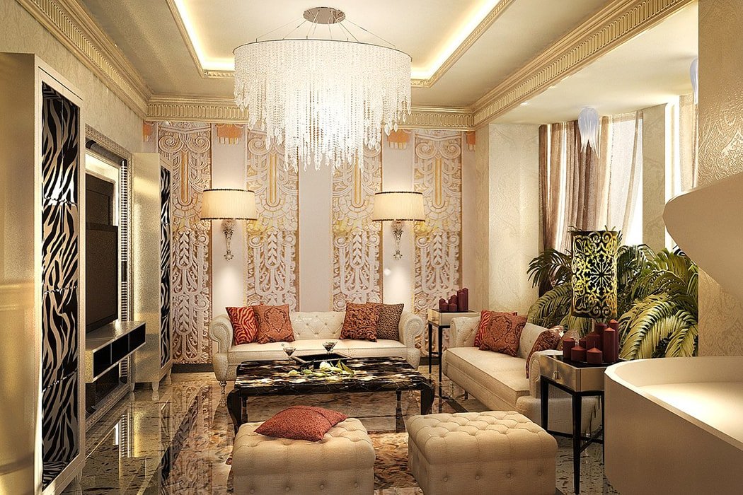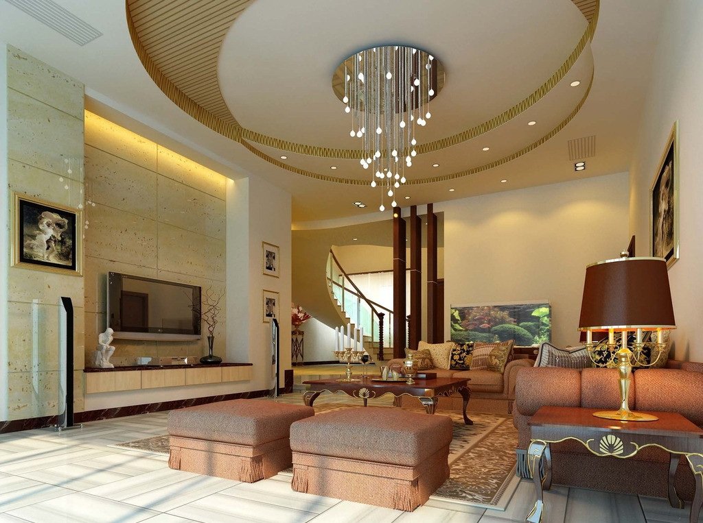Clásico Puede usar diseños de varios niveles, techos curvos, arqueados y complejos. Una lámpara de araña encaja bien en el centro de la habitación.