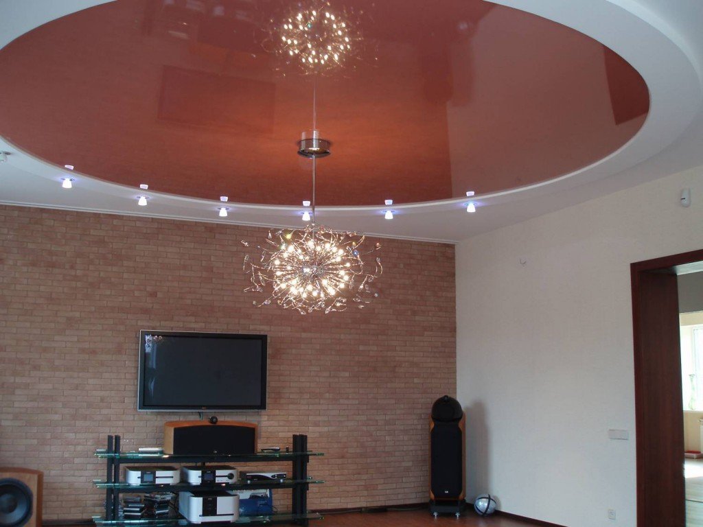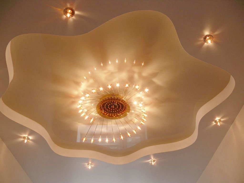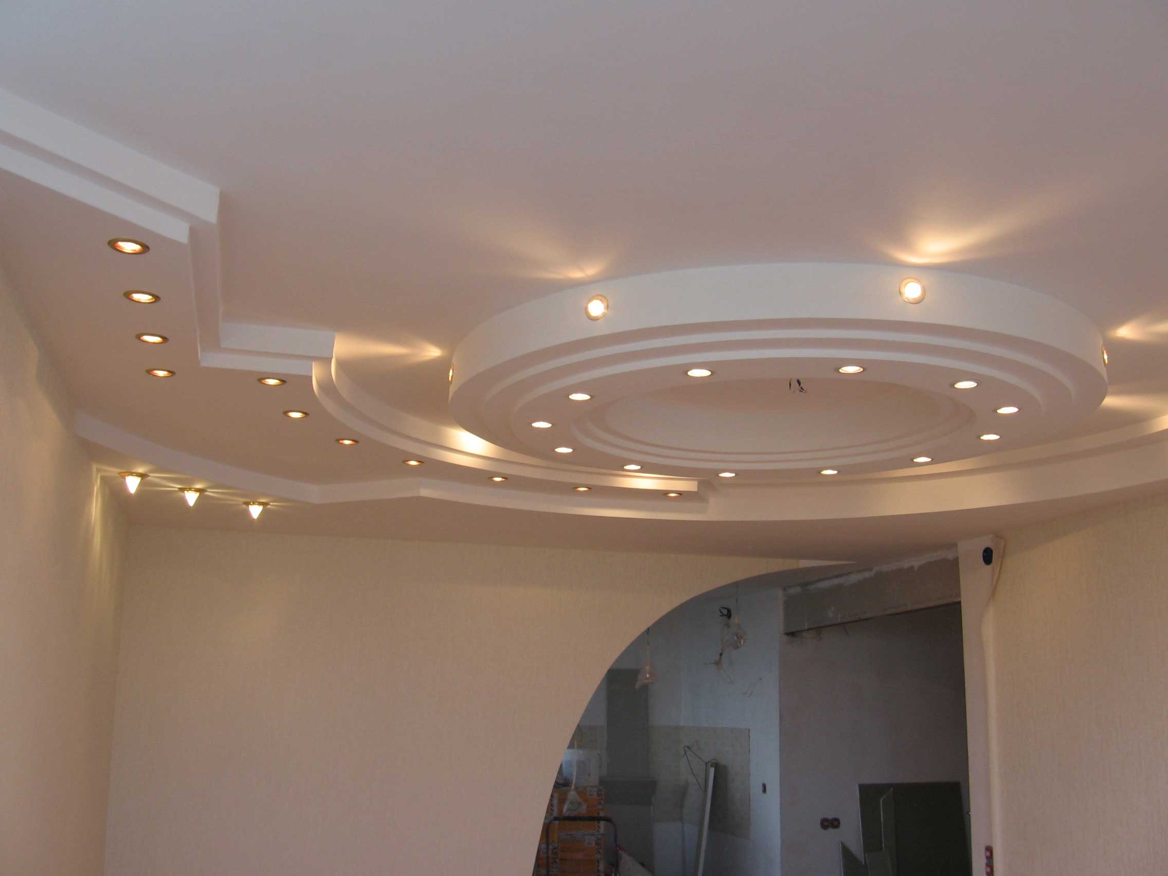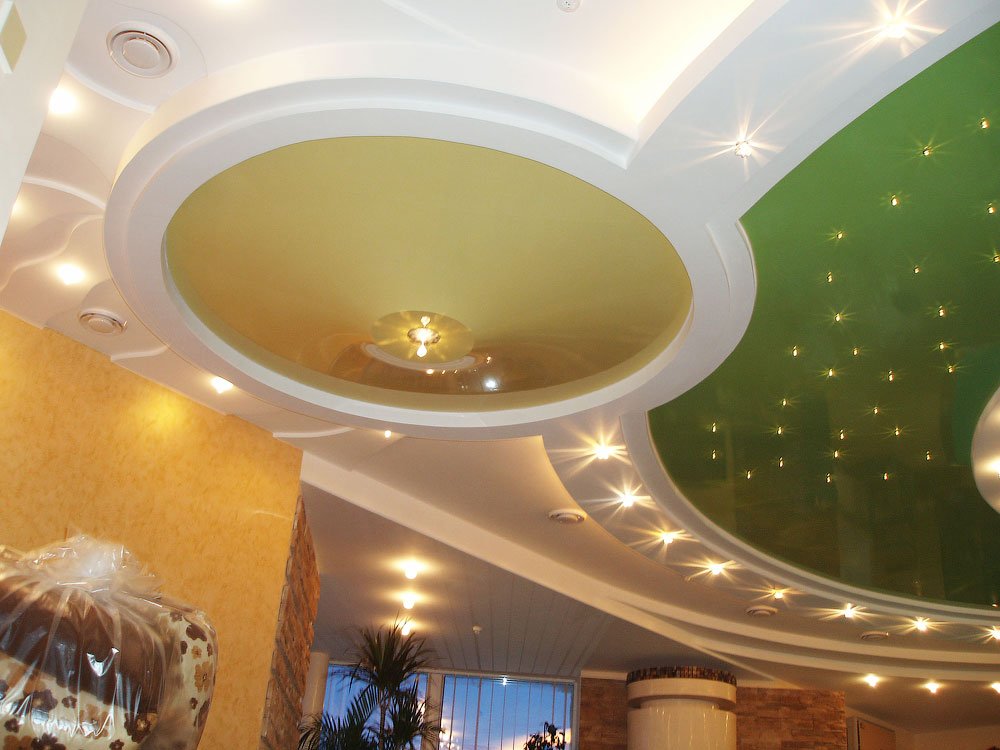Dos, tres niveles. La regla principal es que cada nivel posterior es más pequeño en el área del anterior. Las filas posteriores se montan en el marco principal. Los techos multinivel, a su vez, se dividen en: - marco: el diseño tiene uno o un par de escalones ubicados a lo largo de todas las paredes; - diagonal: el siguiente después del primer nivel se encuentra en la mitad de la habitación, y la línea divisoria (recta, curva) conecta las dos esquinas de la habitación en diagonal; - zonal: el segundo, tercer nivel se usa como el borde de la zona de un propósito específico (comedor, trabajo, lugar de descanso).
