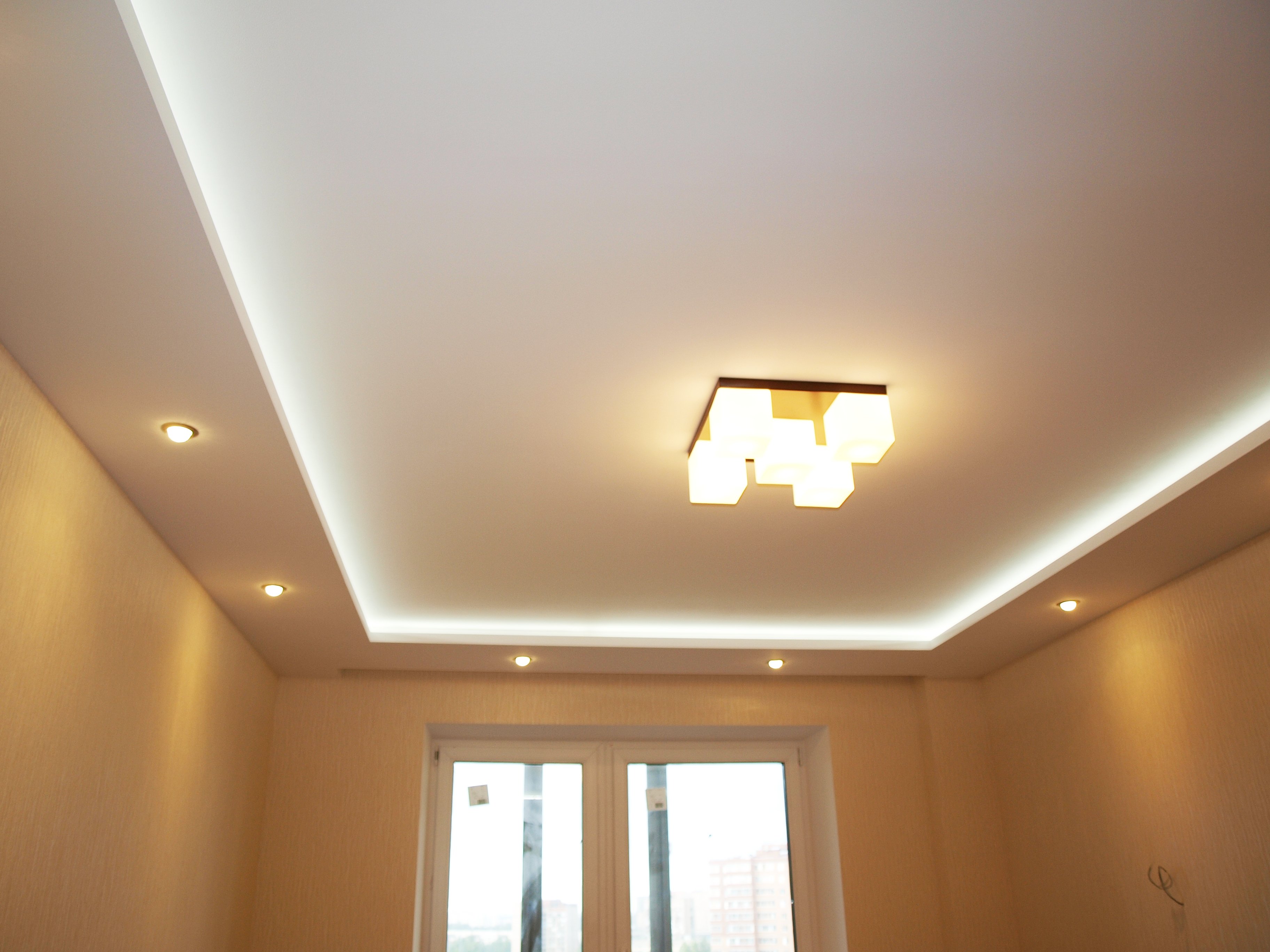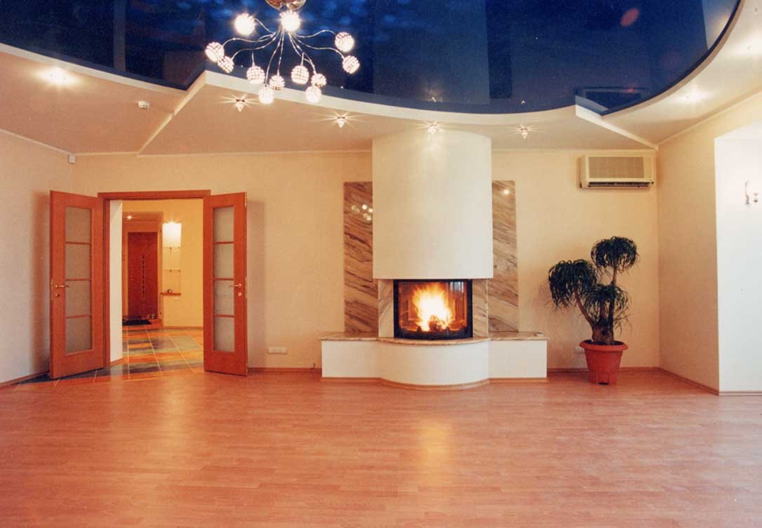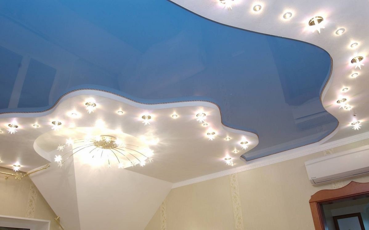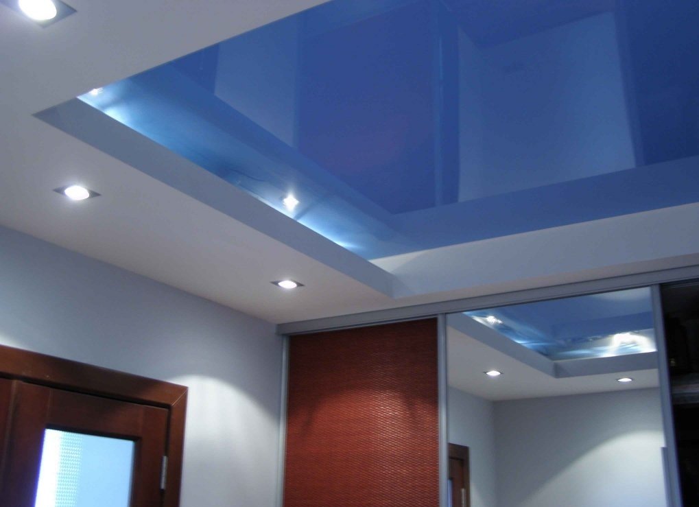 Dos, tres niveles. La regla principal es que cada nivel posterior es más pequeño en el área del anterior. Las filas posteriores se montan en el marco principal. Los techos multinivel, a su vez, se dividen en: - marco: el diseño tiene uno o un par de escalones ubicados a lo largo de todas las paredes; - diagonal: el siguiente después del primer nivel se encuentra en la mitad de la habitación, y la línea divisoria (recta, curva) conecta las dos esquinas de la habitación en diagonal; - zonal: el segundo, tercer nivel se usa como el borde de la zona de un propósito específico (comedor, trabajo, lugar de descanso).