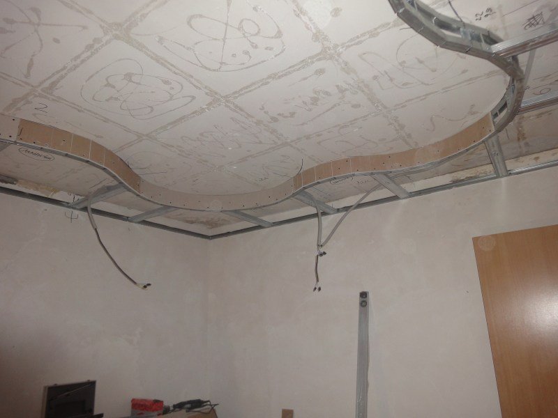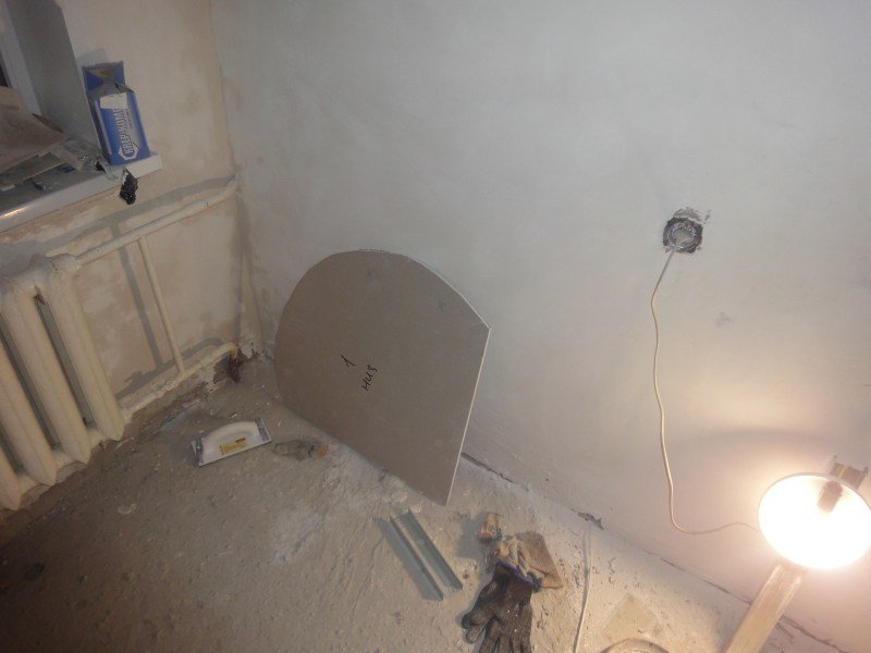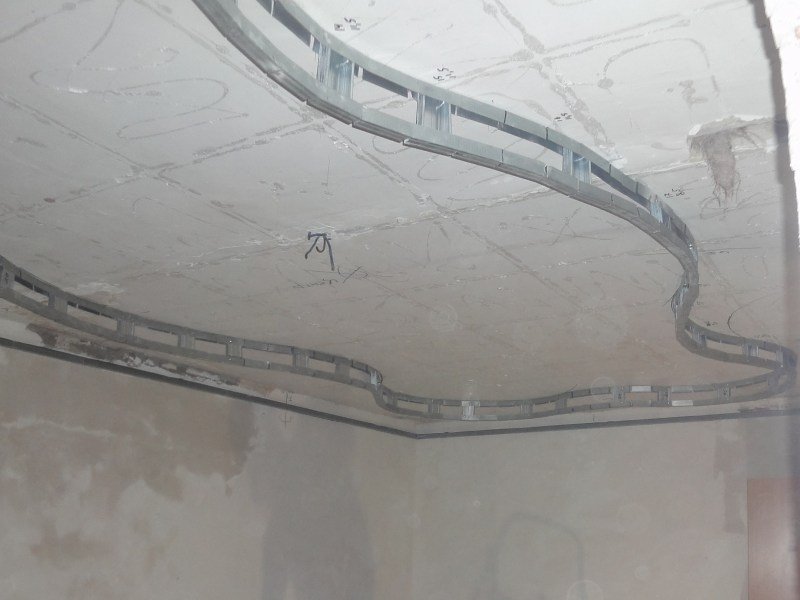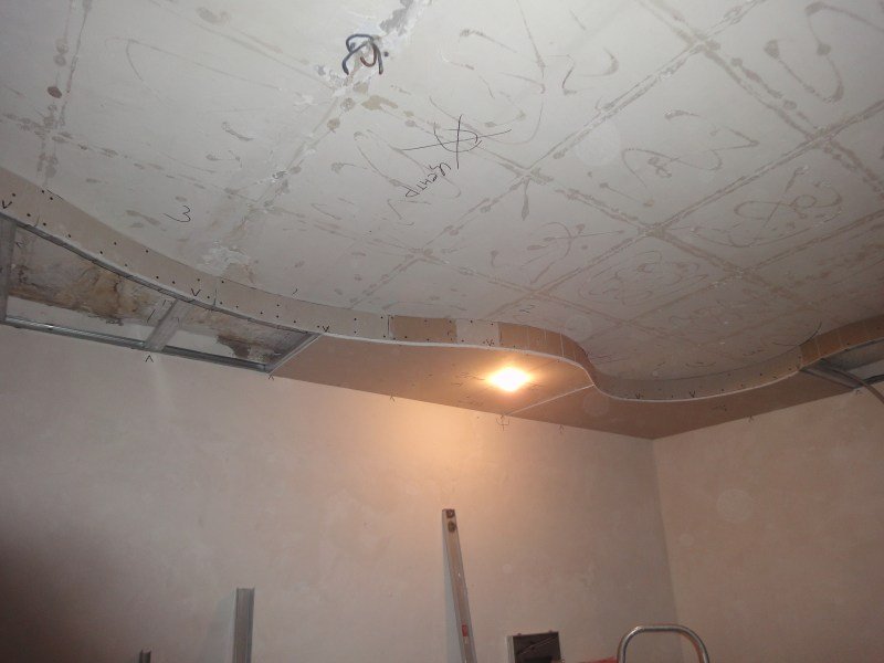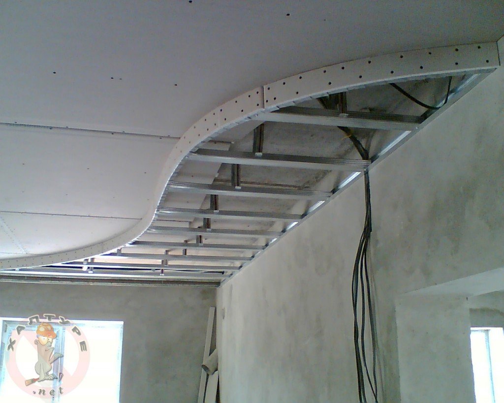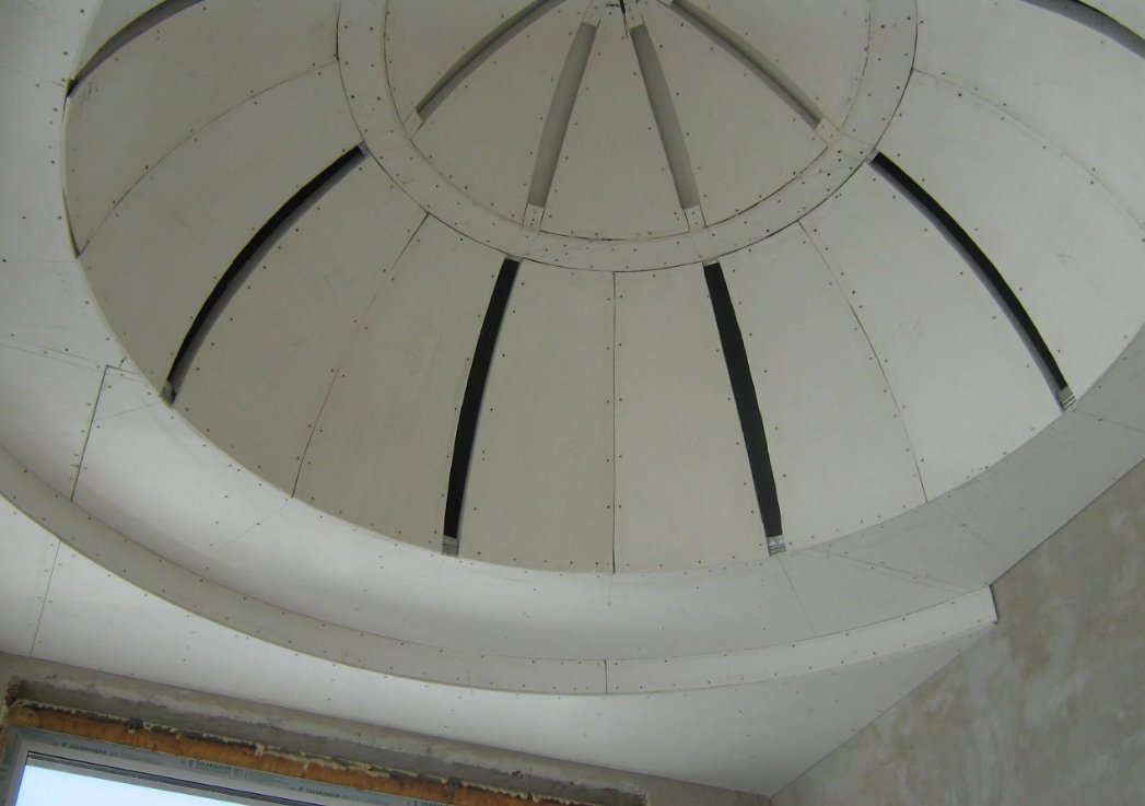 Además de cortar y sellar juntas, las láminas de cartón yeso se pueden doblar, dándoles formas onduladas y curvas, por ejemplo, un arco, un óvalo, un círculo, una línea diagonal curva. Para doblar hojas, use el método seco o húmedo. Junto con la hoja, se dobla el perfil de guía, en el que se realizan cortes en los lados con la ayuda de unas tijeras para metal.