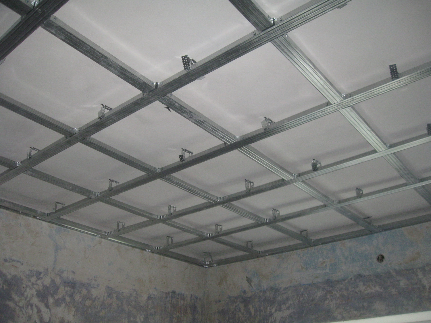 El siguiente paso será arreglar las suspensiones. Están conectados al techo mediante anclajes. La distancia entre los sujetadores colgantes se realiza entre 50 y 60 cm. El primero se instala, retrocediendo a 25 cm de la pared. Después de conectar las suspensiones al perfil, se obtiene un marco terminado.