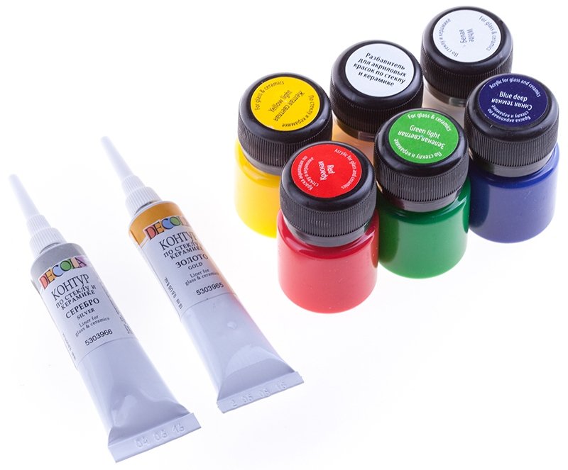 Recetas soviéticas En los años 80-90, se utilizaron pinturas de diversos medios improvisados para pintar vidrio. Para la base de las mezclas, se eligió el pegamento PVA. Se mezcló con colorantes alimentarios, gouache, bolígrafos, acetona y varios solventes.
