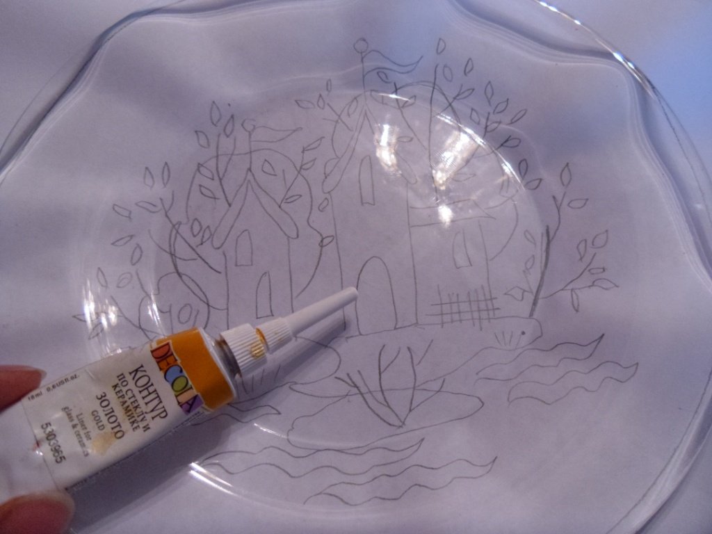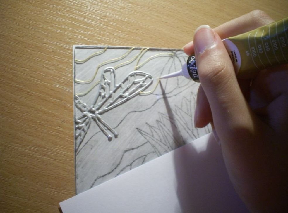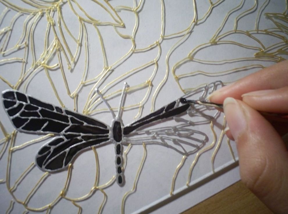 En la superficie del vidrio con un contorno, transferimos todas las líneas. La altura de la mezcla de contorno depende del grosor planificado de la capa de pintura, lo que afecta su transparencia.
