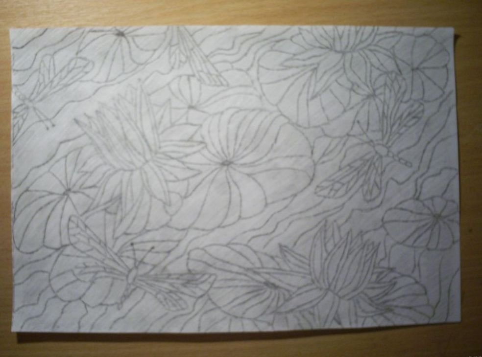 Película adhesiva. Se coloca un trozo de película adhesiva encima del dibujo preparado desde arriba, y para una fijación confiable, debe ser más grande que el boceto. Con un marcador de vidrio, dibuje contornos a lo largo de la superficie del material de embalaje. A continuación, la película con la imagen traducida en la parte frontal se fija en un objeto de vidrio para que no haya vacíos ni pliegues entre ellos. Con la ayuda de un palo de bambú, una pluma de helio, delineamos suavemente los contornos. Como resultado, el marcador se transferirá al vidrio.