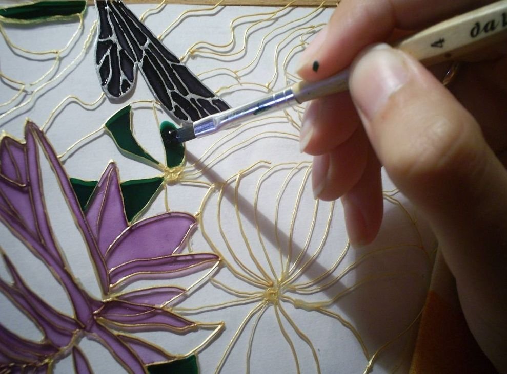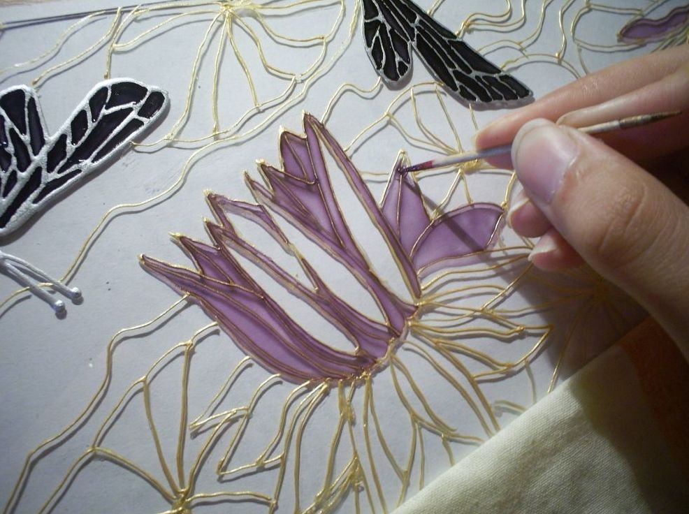 Las pinturas de vidrieras se distinguen por el hecho de que se extienden mucho; por lo tanto, no se recomienda aplicar un color diferente hasta que el anterior se haya secado por completo para evitar la posibilidad de mezclar colores. También es mejor usar barnices a base de resinas orgánicas para el trabajo.