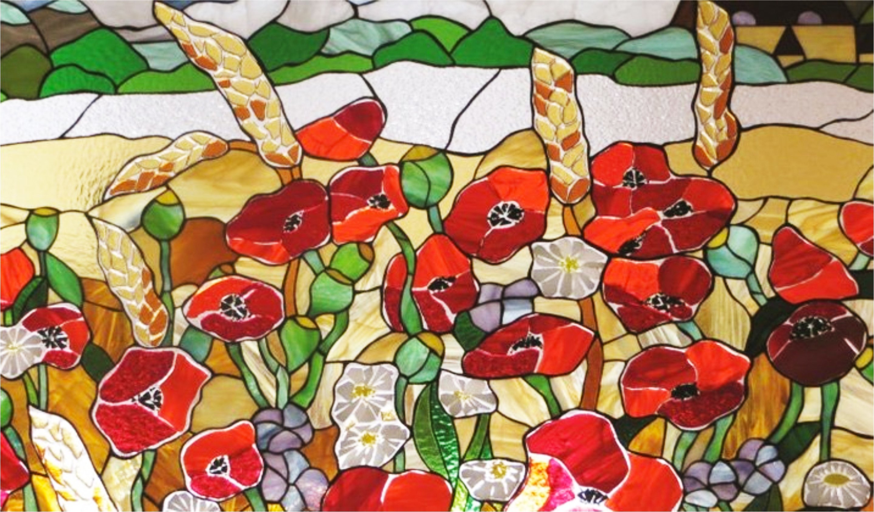 Vidriera de mosaico. Adornos florales geométricos, los patrones de alfombra son característicos;