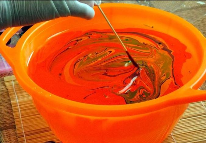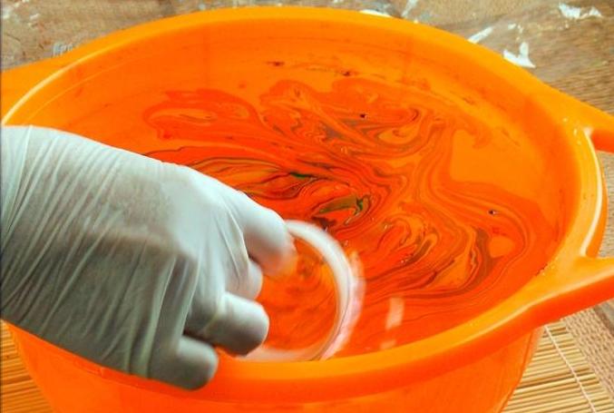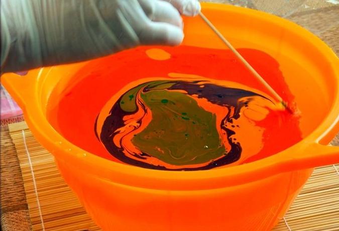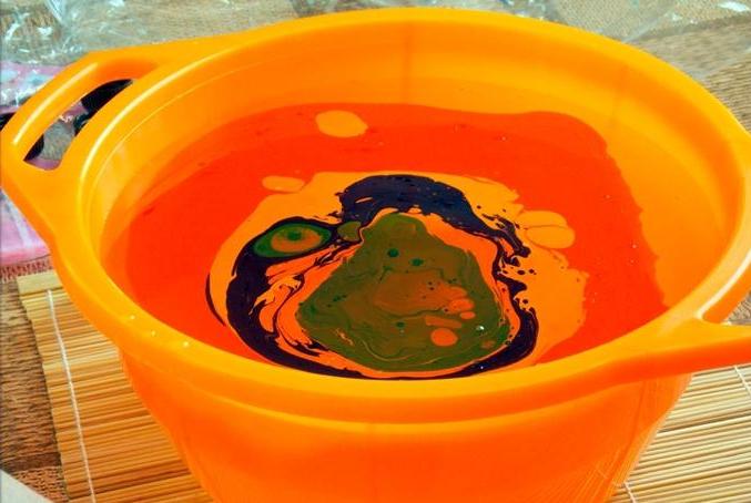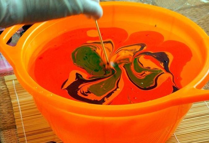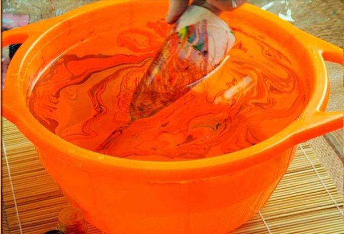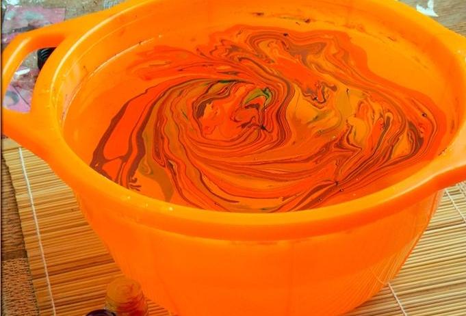 Llenamos un recipiente profundo con agua, goteamos unas gotas de pintura en el centro para marmorizar;