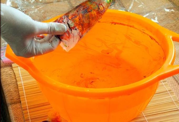 Cuando el tinte se extiende por toda la superficie, goteamos otro color, luego algunos más diferentes y lo diluimos;