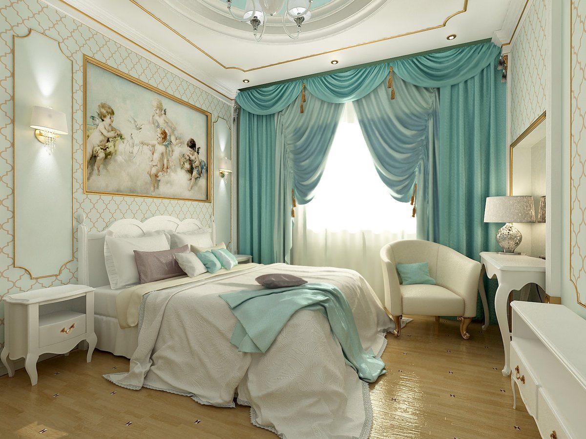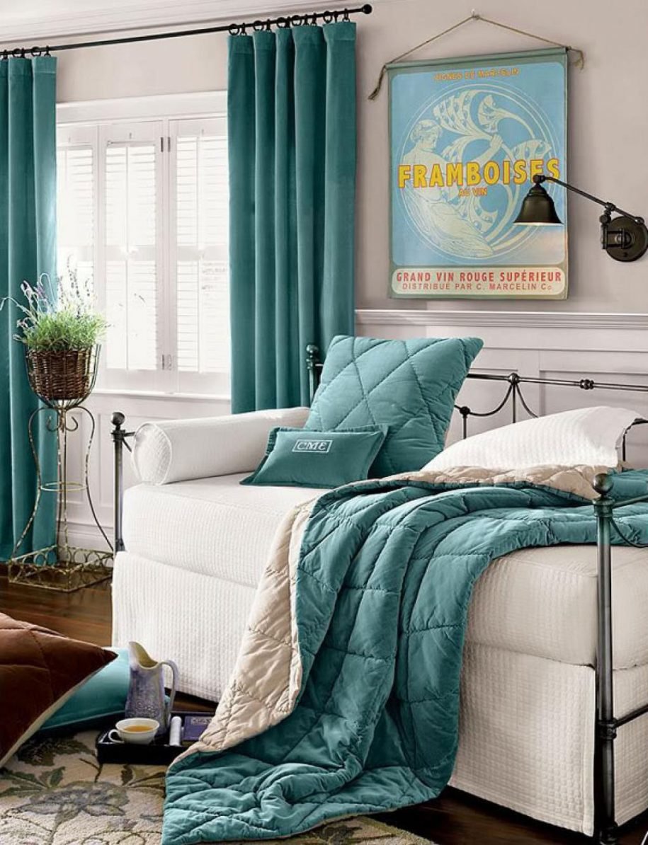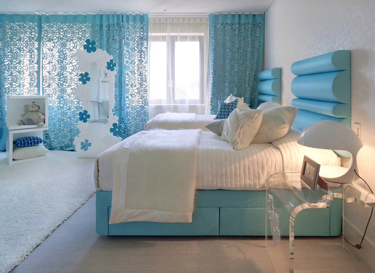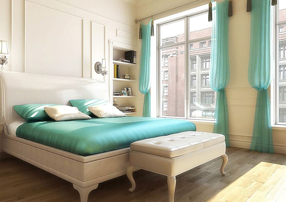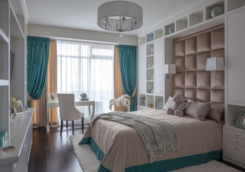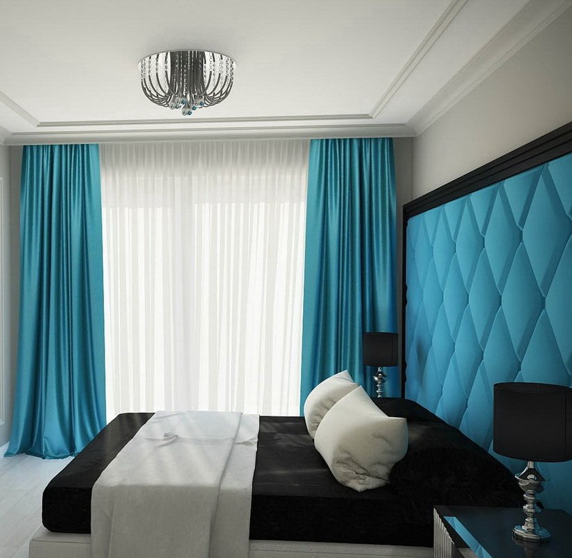 El dormitorio está destinado a la relajación. En esta sala quieres relajarte cómodamente. Para el dormitorio, debe elegir cortinas en tonos apagados de turquesa. Se pueden combinar otros textiles con las cortinas: colcha, almohadas, puf. Los tonos caramelo o chocolate se combinan con tonos turquesa apagados. La habitación, hecha en esos colores, tiene un buen descanso. El dormitorio, decorado en un estilo oriental, también se ve hermoso. En este caso, el color turquesa de las cortinas debe ser oscuro y se combina mejor con dorado. Las cortinas se pueden decorar con borlas con pinceles. El lienzo en sí debe ser monofónico, y el papel tapiz en las paredes debe ser variado. Las cortinas no deberían ser el único punto brillante en el dormitorio. Deben combinarse con otra decoración. Este escenario se ve lujoso y evoca pensamientos de cuentos árabes.
