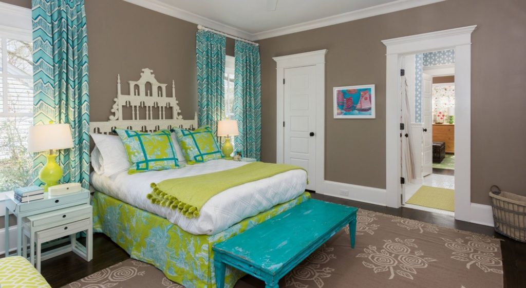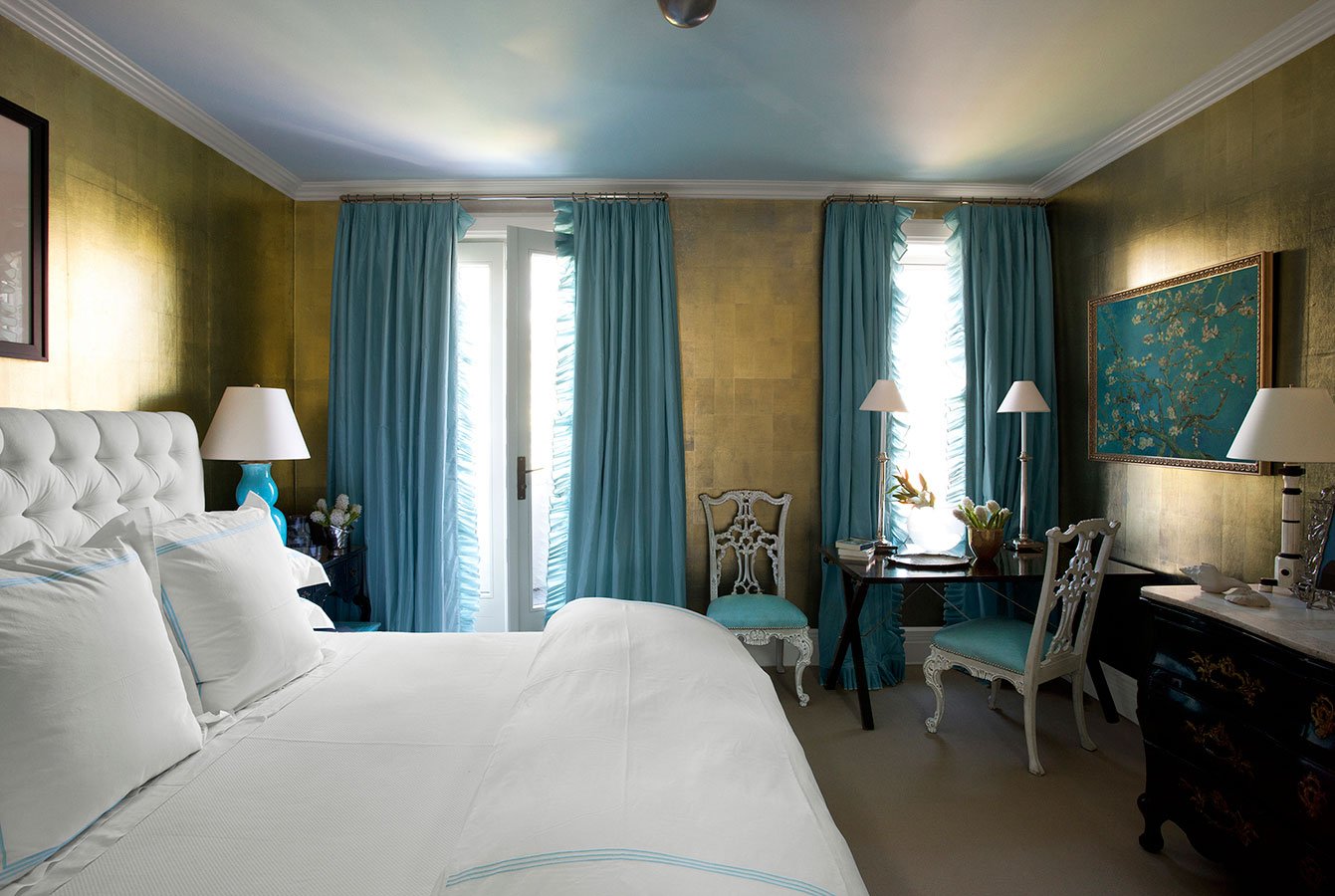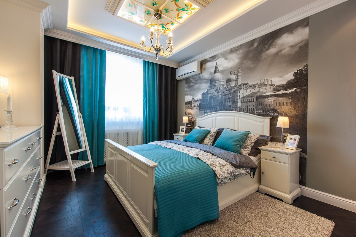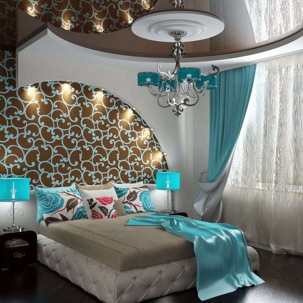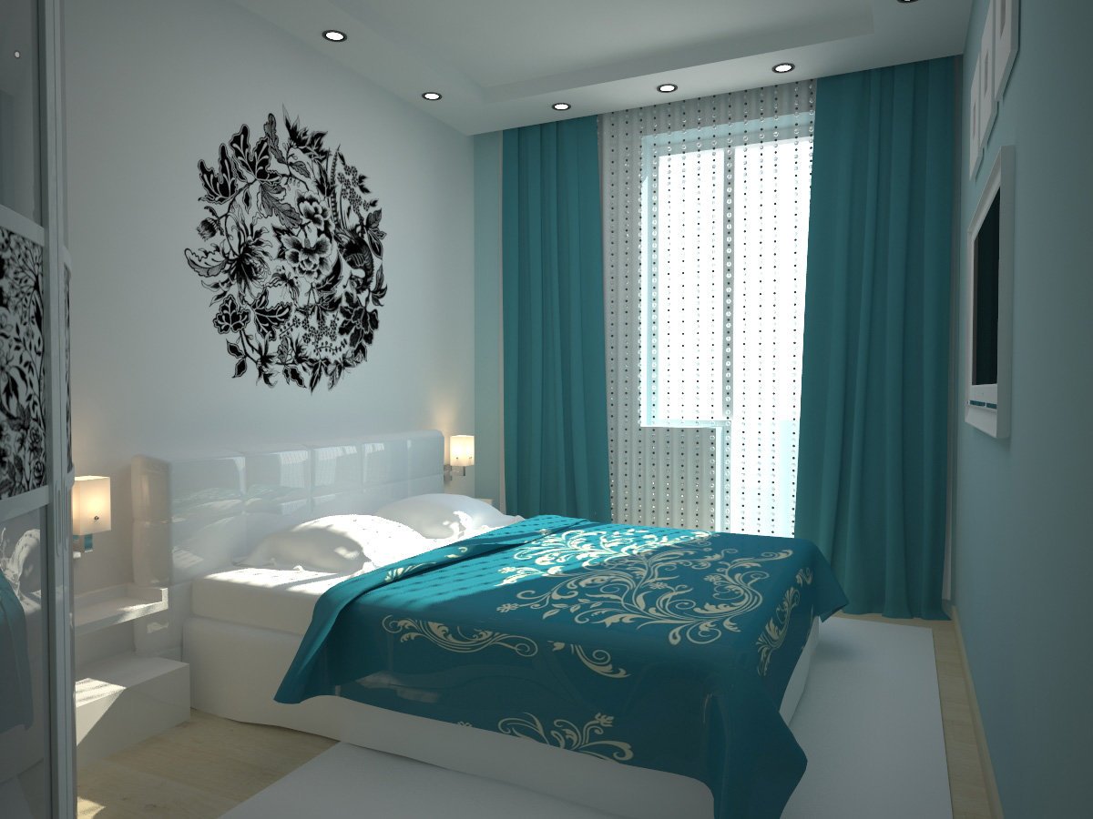 El dormitorio está destinado a la relajación. En esta sala quieres relajarte cómodamente. Para el dormitorio, debe elegir cortinas en tonos apagados de turquesa. Se pueden combinar otros textiles con las cortinas: colcha, almohadas, puf. Los tonos caramelo o chocolate se combinan con tonos turquesa apagados. La habitación, hecha en esos colores, tiene un buen descanso. El dormitorio, decorado en un estilo oriental, también se ve hermoso. En este caso, el color turquesa de las cortinas debe ser oscuro y se combina mejor con dorado. Las cortinas se pueden decorar con borlas con pinceles. El lienzo en sí debe ser monofónico, y el papel tapiz en las paredes debe ser variado. Las cortinas no deberían ser el único punto brillante en el dormitorio. Deben combinarse con otra decoración. Este escenario se ve lujoso y evoca pensamientos de cuentos árabes.