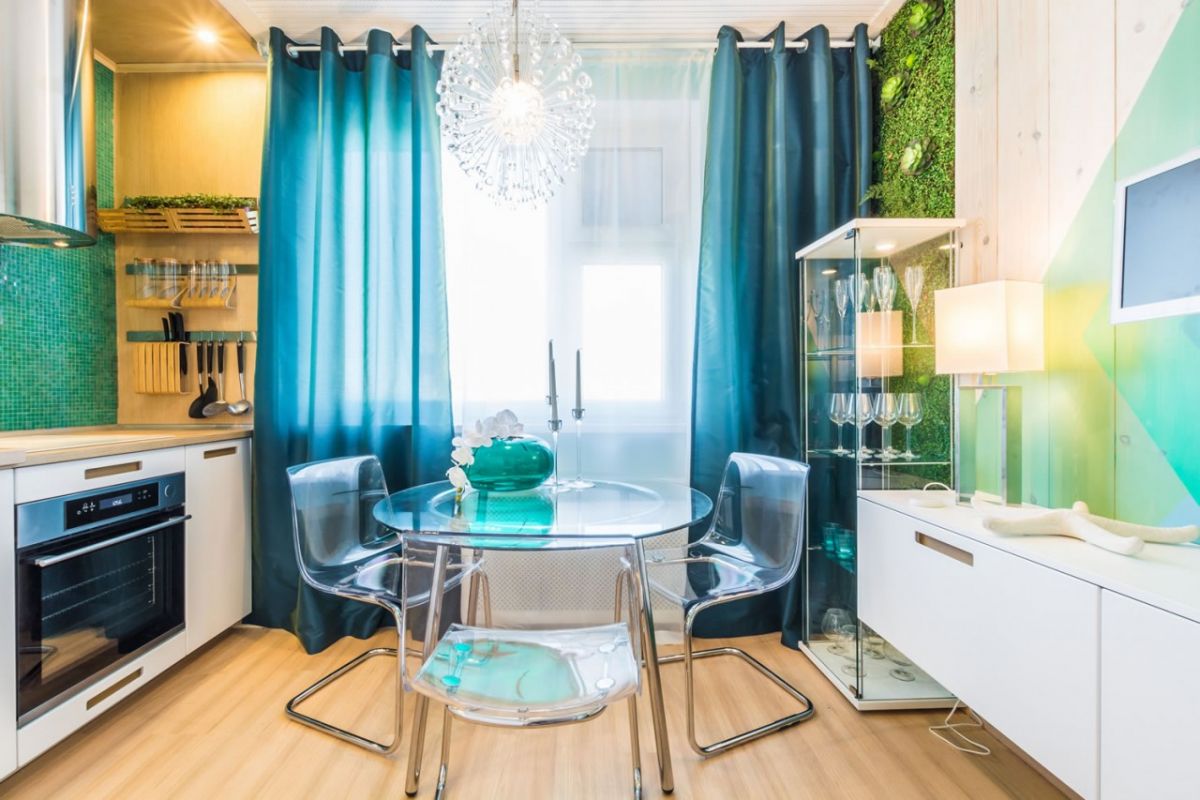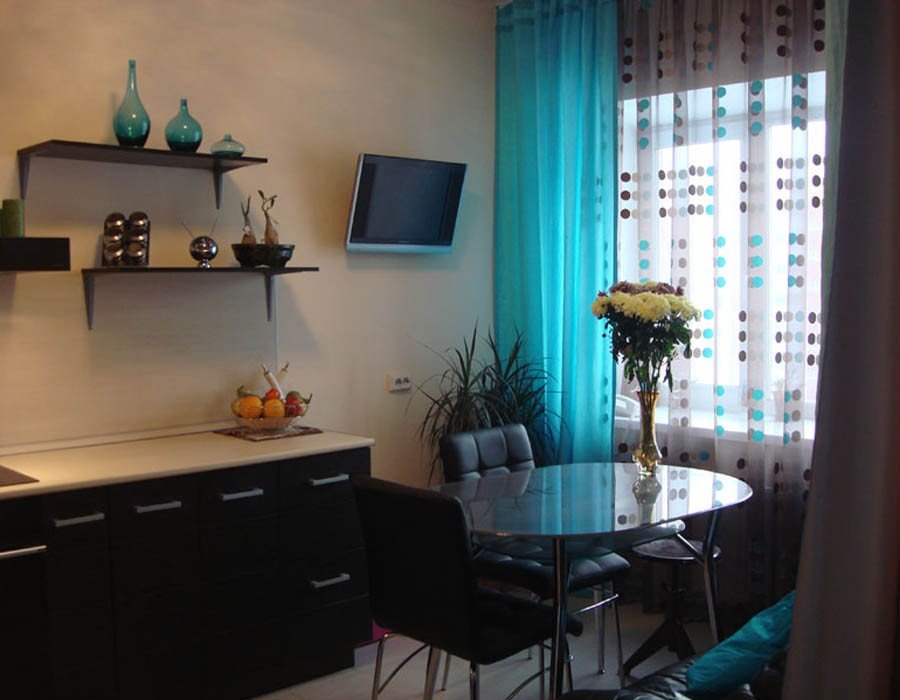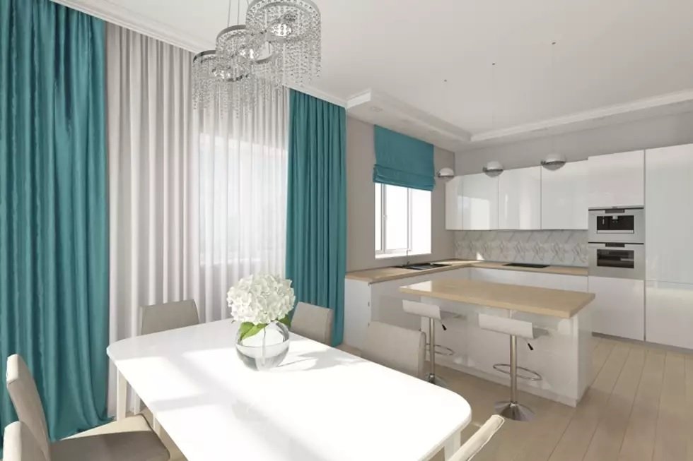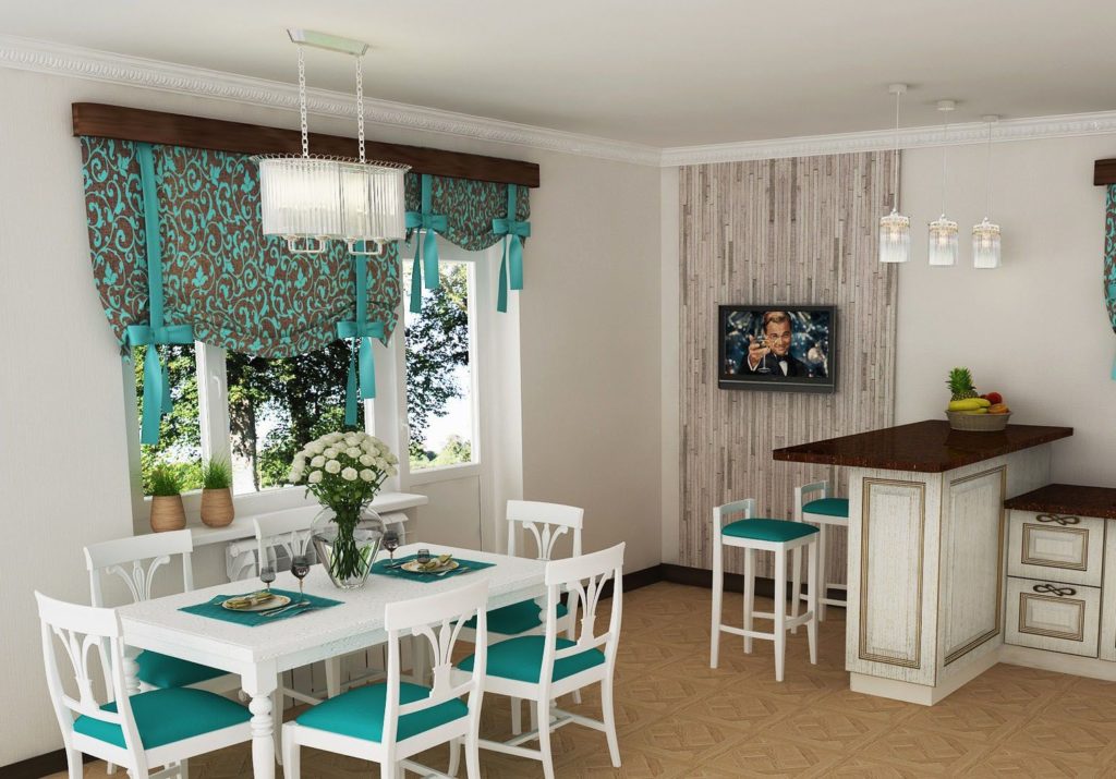 Las cortinas de color turquesa en el área de la cocina se ven originales. Pueden ser densos o ingrávidos. Es en esta sala donde se pueden combinar turquesas y verdes. Para equilibrar el color turquesa en la cocina, use accesorios del mismo color, por ejemplo, jarrones, manteles, vasos, pinturas. En la cocina es más conveniente usar persianas enrollables o persianas romanas. Las persianas de color turquesa se ven inusuales, especialmente en combinación con tonos blancos o chocolate de muebles de cocina. La cocina, decorada en un estilo marino, se verá original. La turquesa es perfecta para la decoración. Las cortinas de color turquesa con temas marinos se ven frescas y originales. Se pueden envolver en aparejos hechos de hilo denso decorado con anclas o conchas. Tales cortinas no tienen que ser simples. Los lienzos pueden tener patrones marinos, y el color turquesa se puede combinar con blanco, azul, marrón o índigo.
