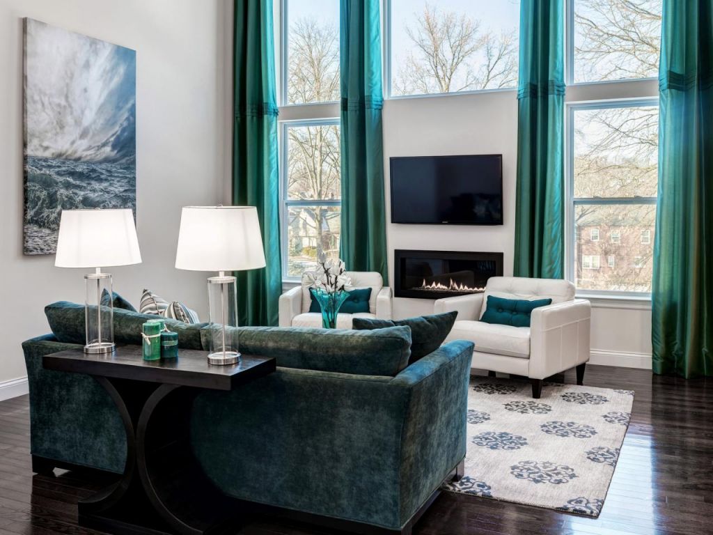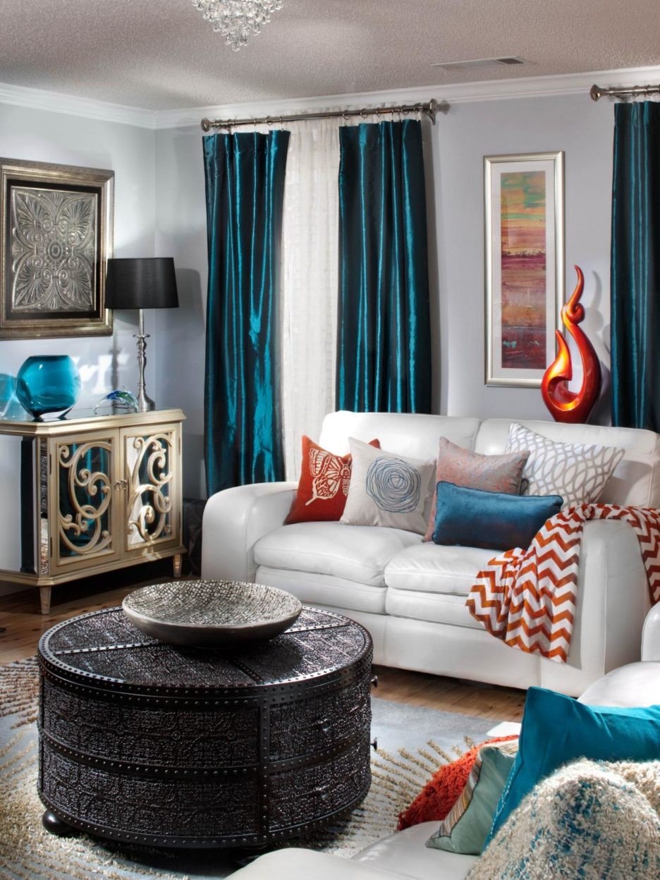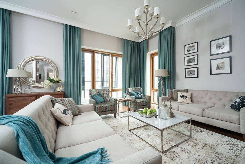 El salón sirve como sala común. Toda la familia se reúne en él para relajarse, celebrar las vacaciones, contarse las últimas noticias o simplemente mirar la televisión con toda la familia. Es por eso que se recomienda equipar esta habitación en un estilo que se adapte a cada miembro de la familia. En este caso, no hay nada mejor que un clásico. Las cortinas turquesas clásicas tienen un corte estricto. Deben coserse con material monofónico caro. La tela puede dar un brillo.En la sala de estar, se debe evitar un exceso de color, así que deje que las cortinas brillantes tomen todo el aspecto, y las diluiremos con pequeños accesorios para que coincidan. Pueden ser marcos de fotos en la pared, recuerdos, una colcha en un sofá de esquina y fundas de almohadas, alfombras, etc. Decorado de esta manera, el salón se verá acogedor y completo.