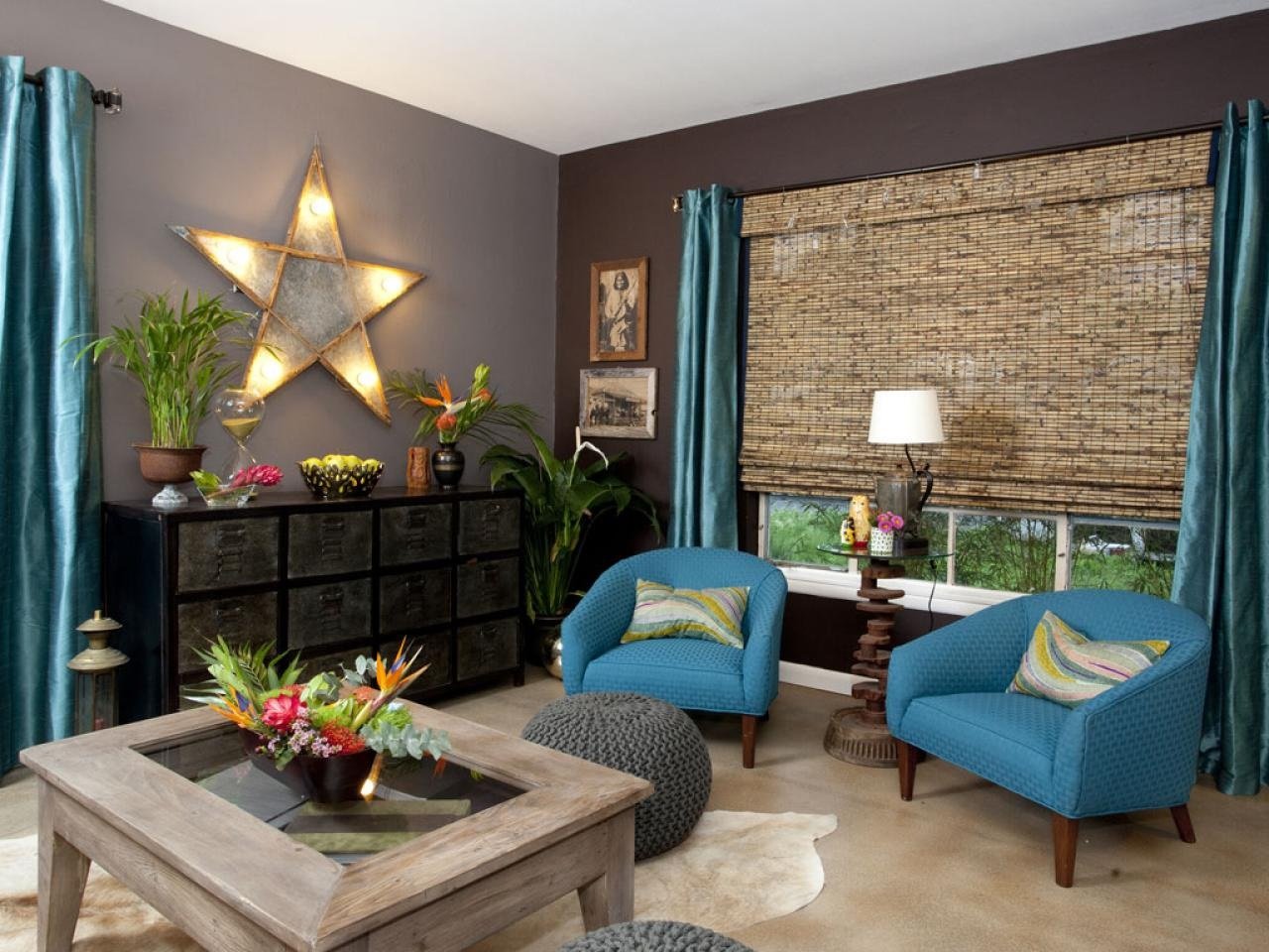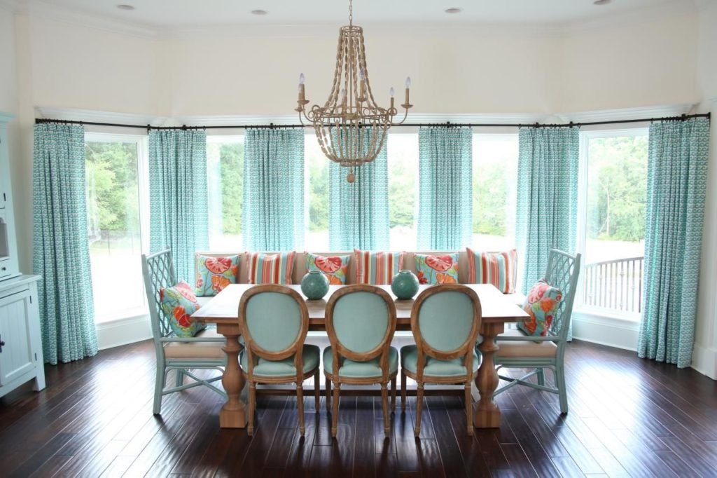 La casa rural tiene una gran área y muchas habitaciones que se pueden decorar con el mismo estilo. El tono turquesa también es adecuado para cortinas rústicas, solo que esta vez no será un monopolio, sino cortinas con un estampado turquesa de plantas. Los diseñadores recomiendan el uso del estilo provenzal en interiores. Se ve familiar. La paleta de colores que se usa en este estilo debe ser tranquila. La mayoría de las veces usan color beige. Sin embargo, esta suavidad se diluye con estampados florales. Los textiles a menudo usan color lavanda, turquesa, azul, amarillo, verde. Se pueden combinar de forma segura entre sí. Las cortinas turquesas al estilo provenzal se pueden decorar con bordados. Las cortinas también están decoradas con lazos, volantes, borlas y todo tipo de adornos. En tono a las cortinas, puede elegir textiles para el sofá.