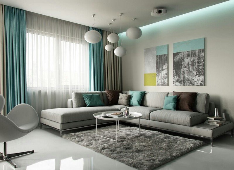 El turquesa es un color autosuficiente. Para evitar el desequilibrio, debe combinar los tonos correctamente y dosificar hábilmente los acentos brillantes. La habitación se verá armoniosa si sus colores básicos son blanco, beige o marrón, y los tonos turquesa. En este caso, el color turquesa se puede usar en textiles, por ejemplo, cortinas. La ventana se puede decorar con cortinas de diferentes cortes. Las cortinas romanas se ven hermosas en un tono turquesa. Van bien con tul blanco como la nieve. Los paneles de cortina agregan entusiasmo al interior. Este diseño puede ser multicolor, donde se combina el turquesa, por ejemplo, con el beige. La última tendencia son las cortinas de color block. Se cosen en bloques de materiales multicolores. Tales cortinas permiten usar turquesa en combinación con amarillo o gris. En los apartamentos modernos, se cuelgan cortinas en los ojales. Son ideales para cualquier interior de apartamentos. Las cortinas de color turquesa en los ojales pueden decorar tanto la cocina como la guardería, el dormitorio o la sala de estar.