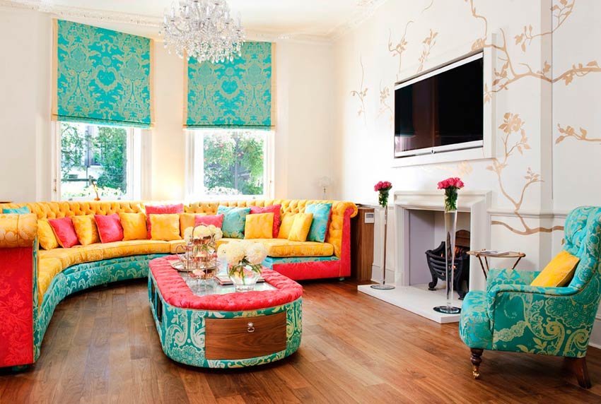 Las cortinas turquesas pueden ser diferentes. Estas no son necesariamente aburridas cortinas lisas. Intente experimentar y combinar el turquesa con algunos otros tonos no triviales, como el rojo, rosa, morado o naranja. La regla principal al combinar estos tonos es no reproducirlos. Dosis de colores suavemente. El color turquesa es aplicable a casi cualquier interior, con la excepción del estilo inglés. Hoy puedes comprar cualquier modelo de cortinas. En casos extremos, las cortinas se pueden coser independientemente de acuerdo con los patrones que se pueden encontrar en Internet. Lo principal es encontrar un material adecuado de un tono turquesa. Para coser cortinas use algodón, batista, lino, lana, satén. Los materiales se pueden combinar entre sí, así como los colores. La turquesa combina bien con el beige, blanco, marrón y amarillo.