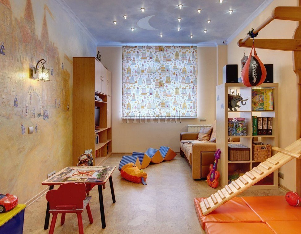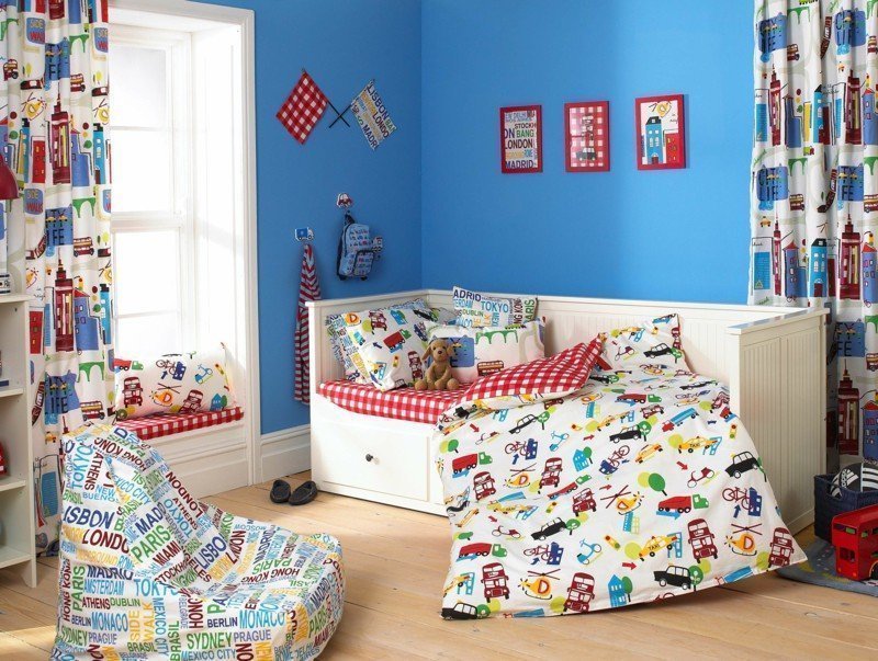 Para la habitación de un niño en edad preescolar, se recomienda elegir textiles para ventanas con imágenes vívidas de animales, figuras, números o automóviles. Los modelos o lienzos de dos y tres colores con la imagen de sus héroes de dibujos animados favoritos son más adecuados para los escolares. Por ejemplo, los textiles con una franja azul y blanca ayudarán a diseñar la habitación de un marinero. Se complementan bien con un delgado lambrequin con la imagen de los barcos. Un niño aficionado a la ciencia y la aventura preferirá cortinas con mapas, cielos estrellados. Los verdaderos fanáticos de los animales pueden diseñar una habitación al estilo de la jungla y complementarla con textiles que representan elefantes, monos y otros habitantes de la sabana. Los modelos con imágenes de personas, héroes múltiples y automóviles se convertirán en un elemento clave del diseño. Para implementar esta idea, es conveniente imprimir la imagen seleccionada en cortinas japonesas o clásicas.