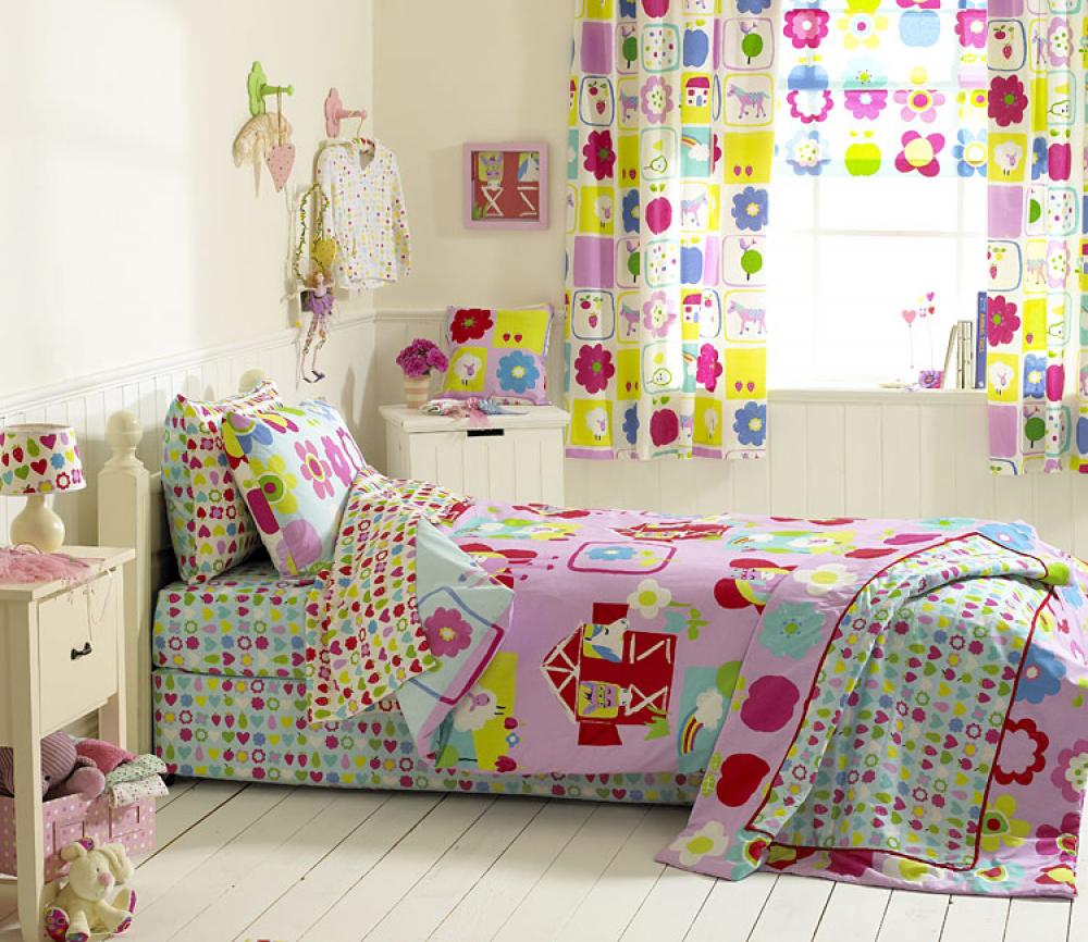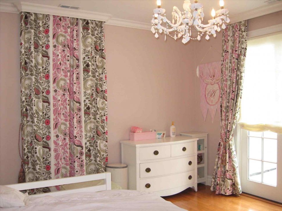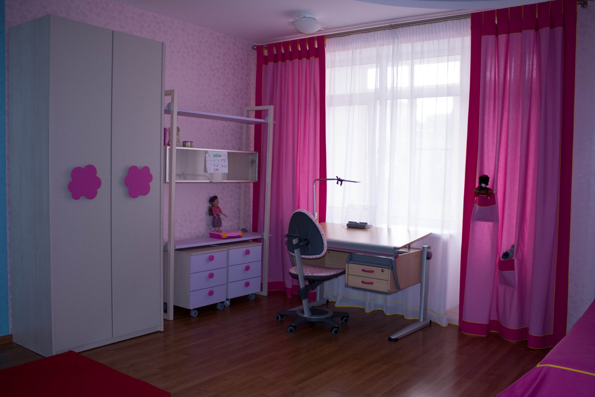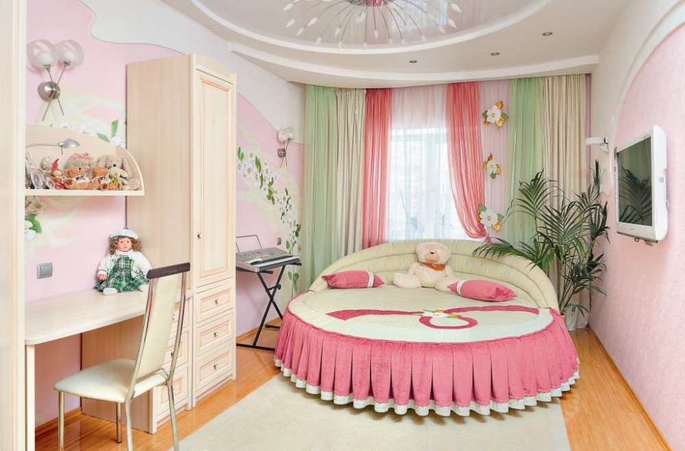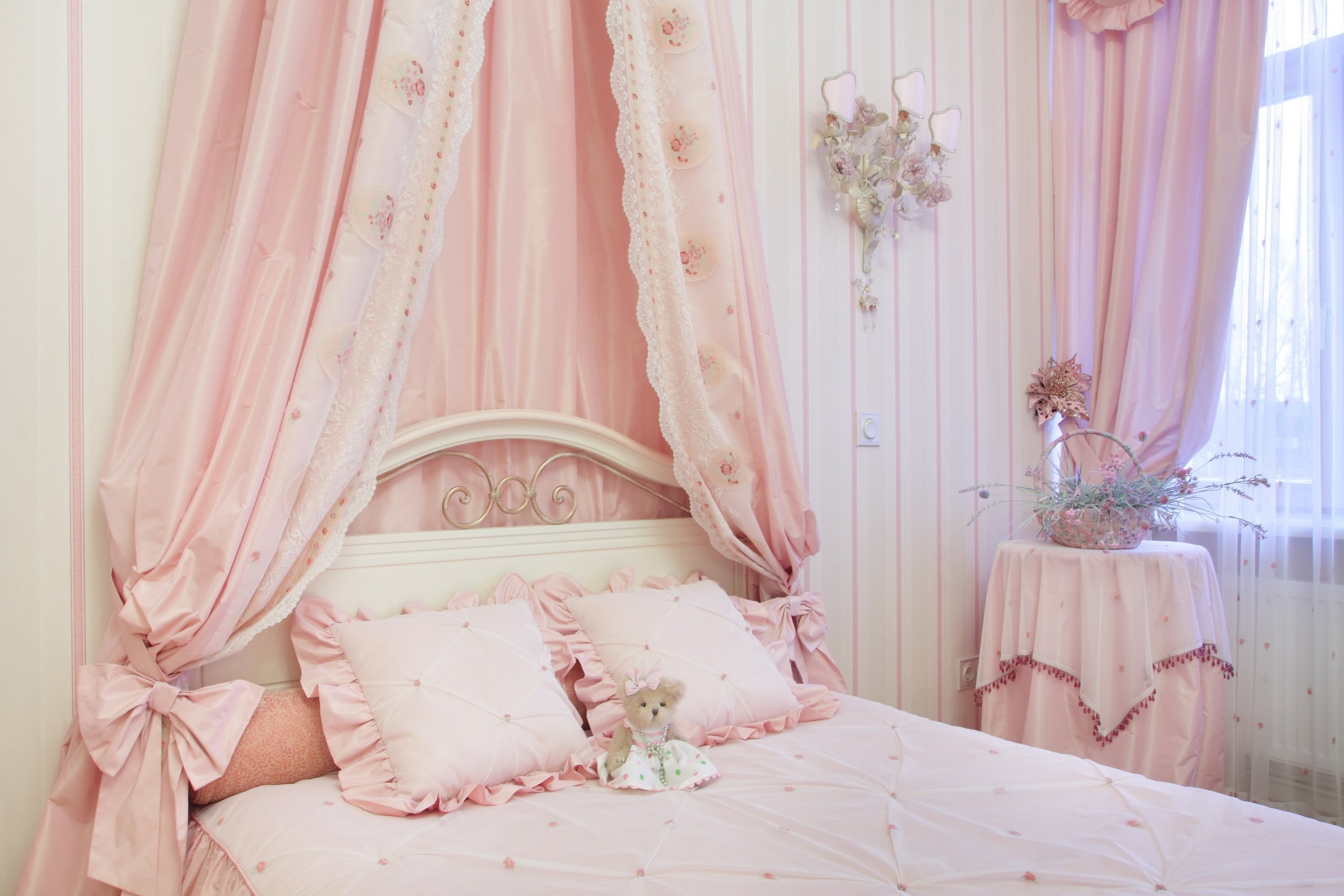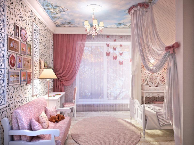 Para el dormitorio en el que vivirá la niña, puede elegir textiles para ventanas en colores coral, morado, rosa y crema. A la princesita definitivamente le gustarán las telas con la imagen de diferentes insectos (mariposas, abejas), hermosas flores. Las imágenes pueden ser grandes o alinearse en zigzags, rayas horizontales. Además, las cortinas que tienen un borde vertical en los lados en forma de patrones florales y frondosos también son adecuadas para un dormitorio. La elección de textiles verdes lisos, complementados en la parte superior con un pequeño lambrequin con la imagen de las flores, también ayudará a decorar la habitación de la dama. A las colegialas les pueden gustar los lienzos planos con imágenes de princesas, castillos, hadas impresas en ellas. Para complementar este diseño ayudará un pequeño flequillo en los bordes de las pinturas o encajes en la parte inferior de la tela.