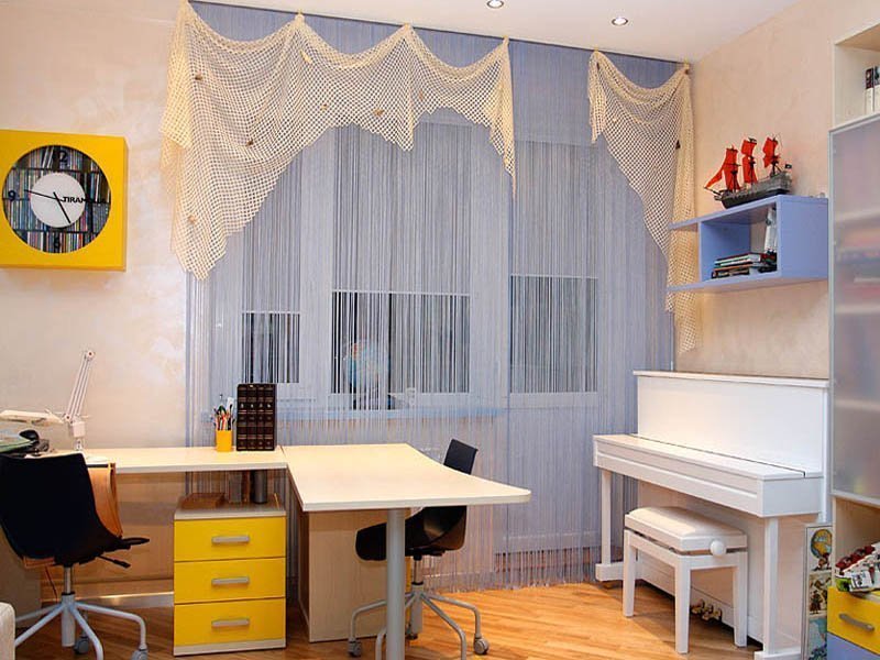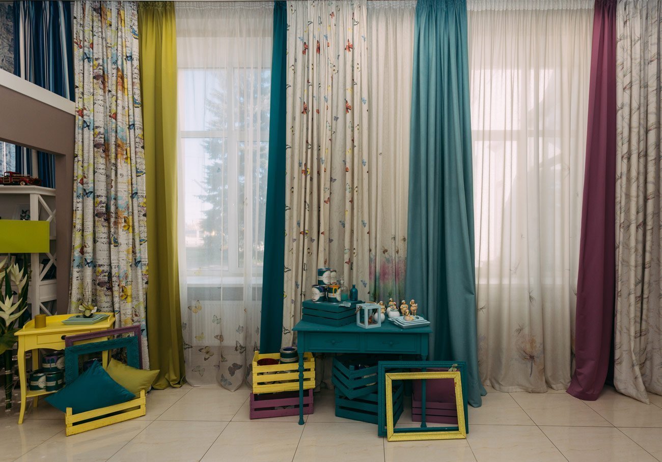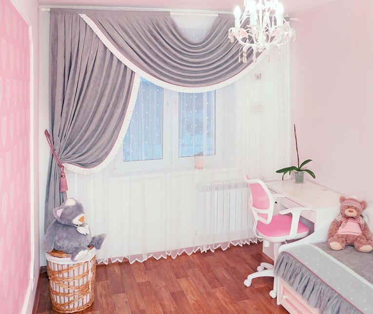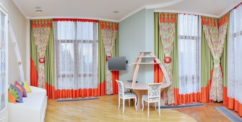 La elección de los textiles para ventanas debe realizarse de acuerdo con el interior creado. Para habitaciones pequeñas, se preferirán modelos con olas mínimas y formas simples. En la espaciosa habitación infantil, se permite el uso de pinturas de varios niveles con lambrequines o productos en un diseño no estándar. Si hay formas geométricas en el estilo, se recomienda seleccionar textiles para ventanas en una versión de un solo color o con grandes formas brillantes. Tales lienzos "simples" serán apropiados en salas temáticas: no sobrecargarán el diseño con detalles innecesarios. El estilo moderno de la habitación sin ningún patrón en la decoración, los textiles permite la selección de modelos con pequeños adornos, patrones e incluso imágenes de personas, animales. La última opción es óptima para un estilo simple y rápido de la habitación, subrayando la apertura de la ventana.