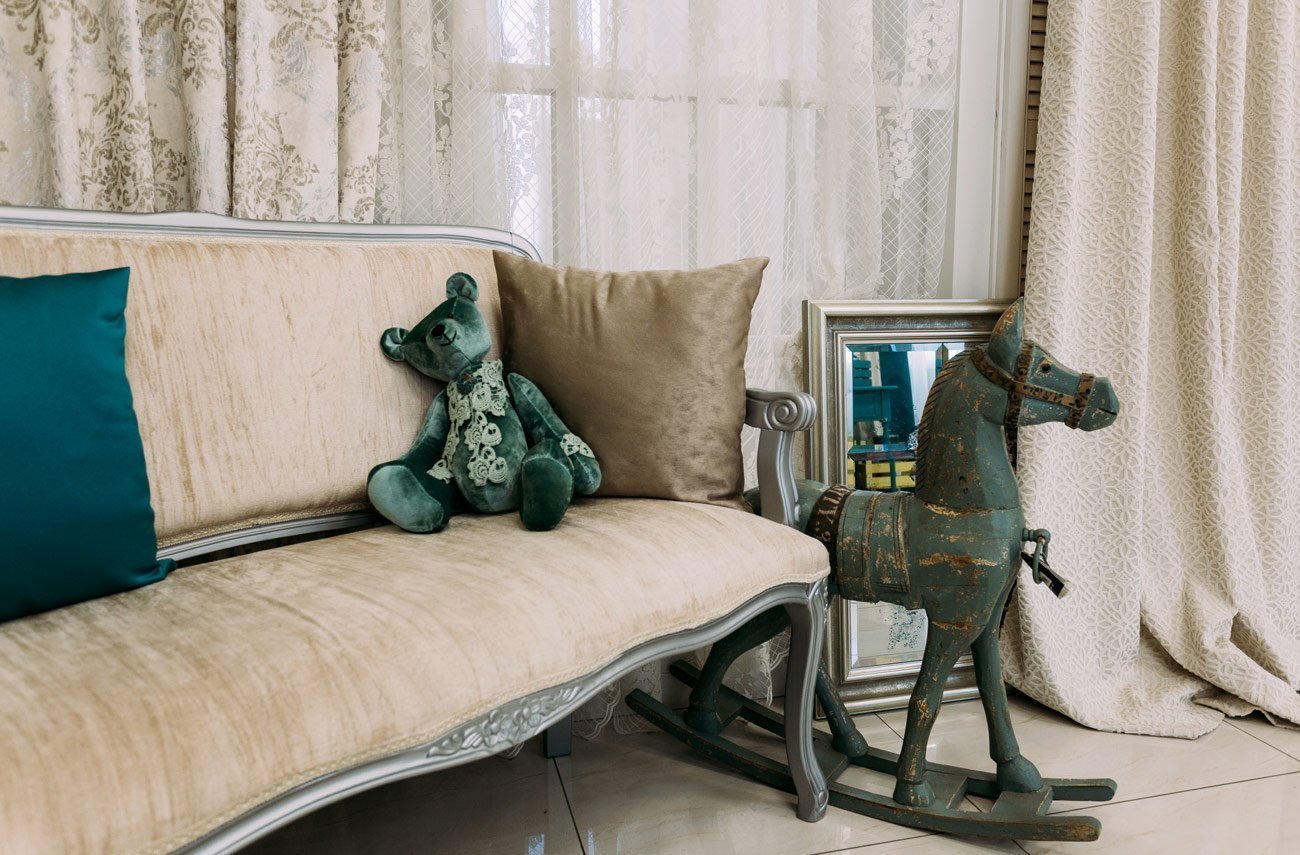 La diferencia de color entre la tela seleccionada y los acabados disponibles. Las paredes y los textiles de las ventanas, idénticos en tono y estructura, crearán una superficie plana y violarán la estilización.