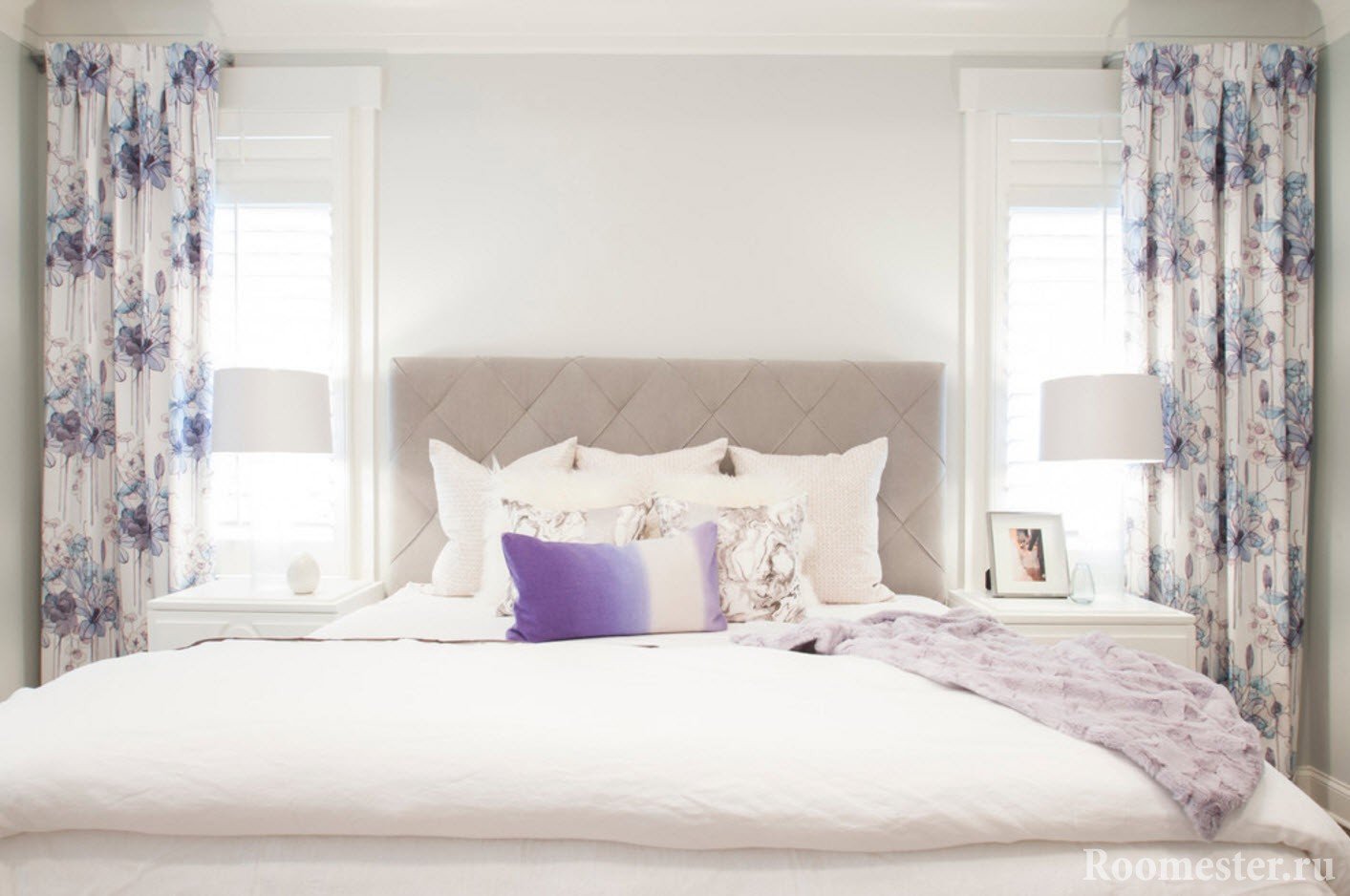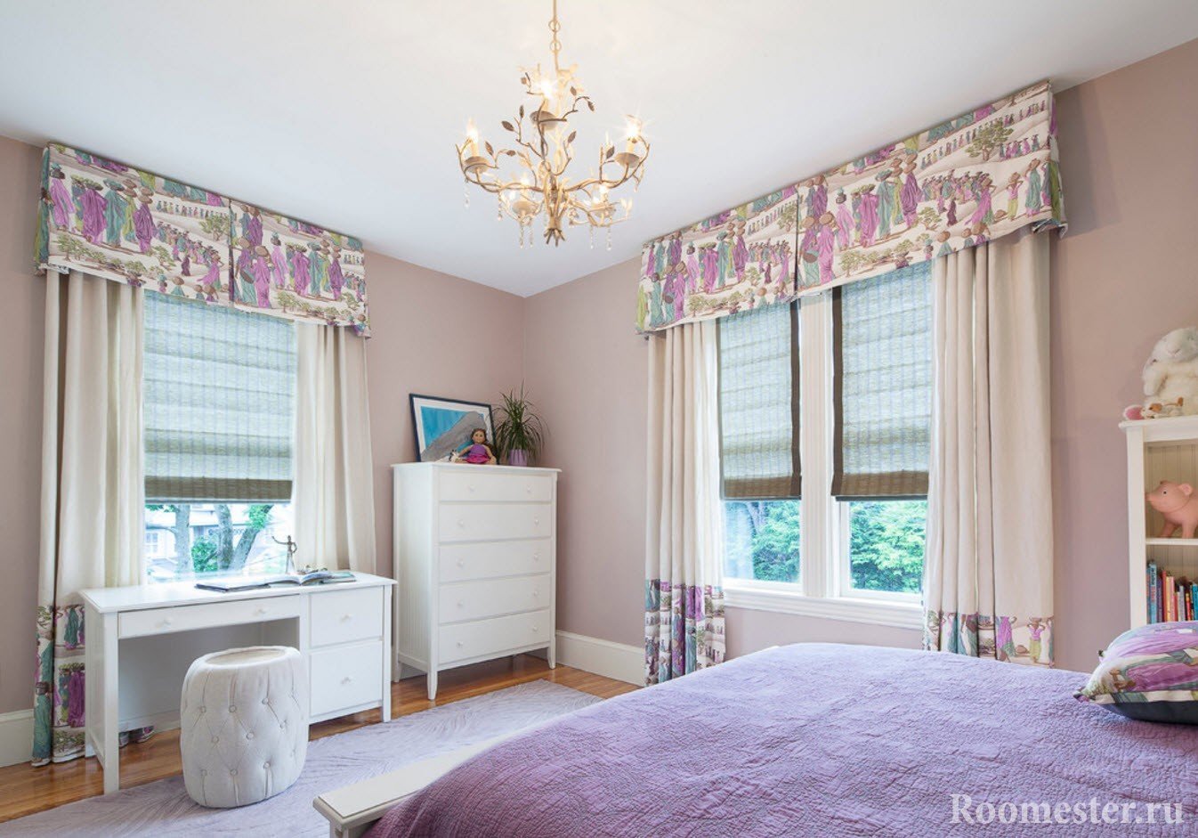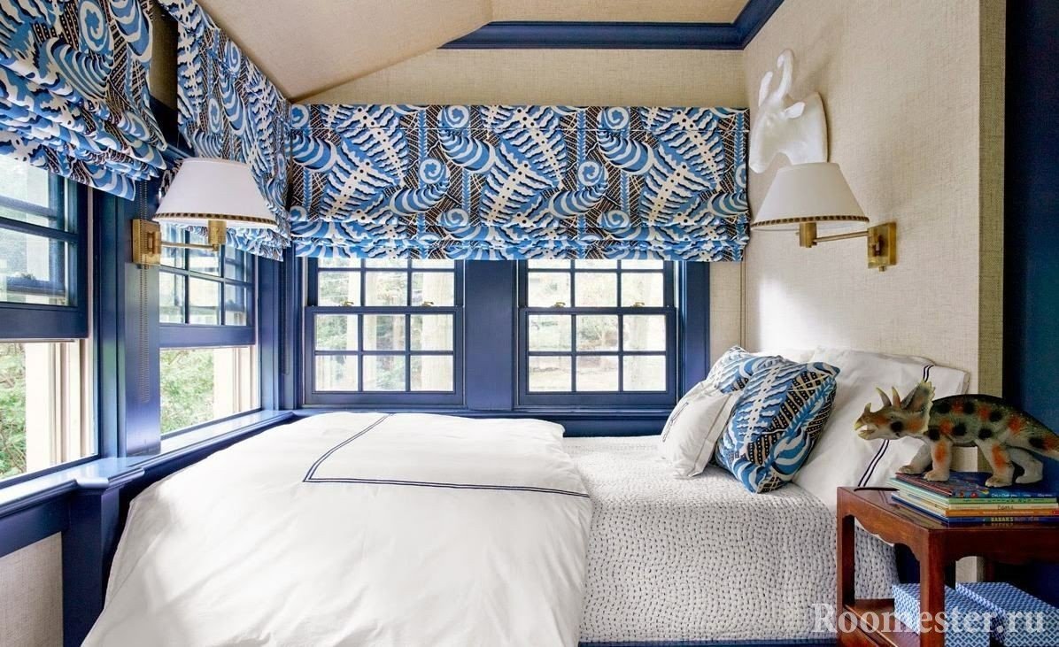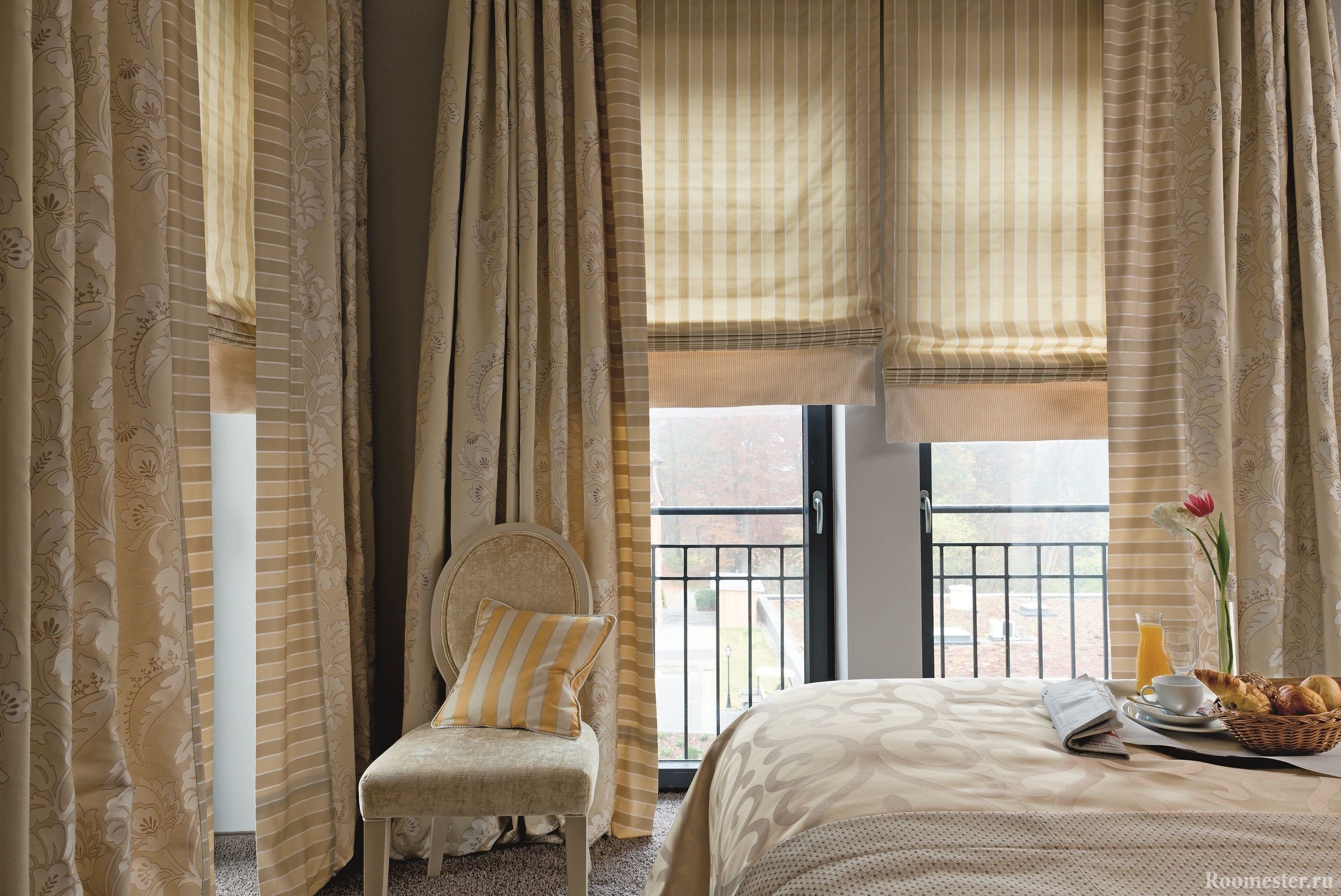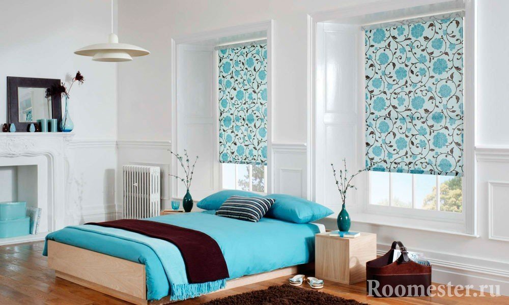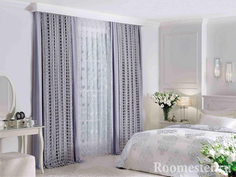 Una lectura moderna del diseño de la habitación implica, en primer lugar, comodidad para el propietario y, por lo tanto, en la foto puede encontrar combinaciones de cortinas enrollables o romanas con hermosas cortinas en los lados que realizan una función decorativa.