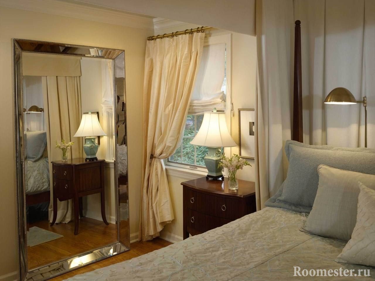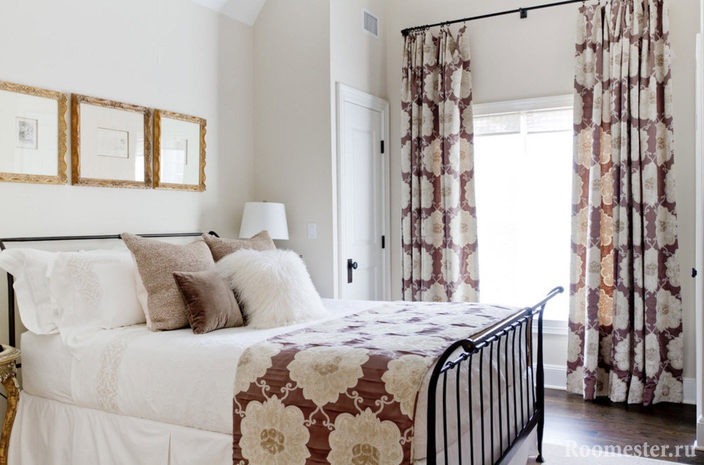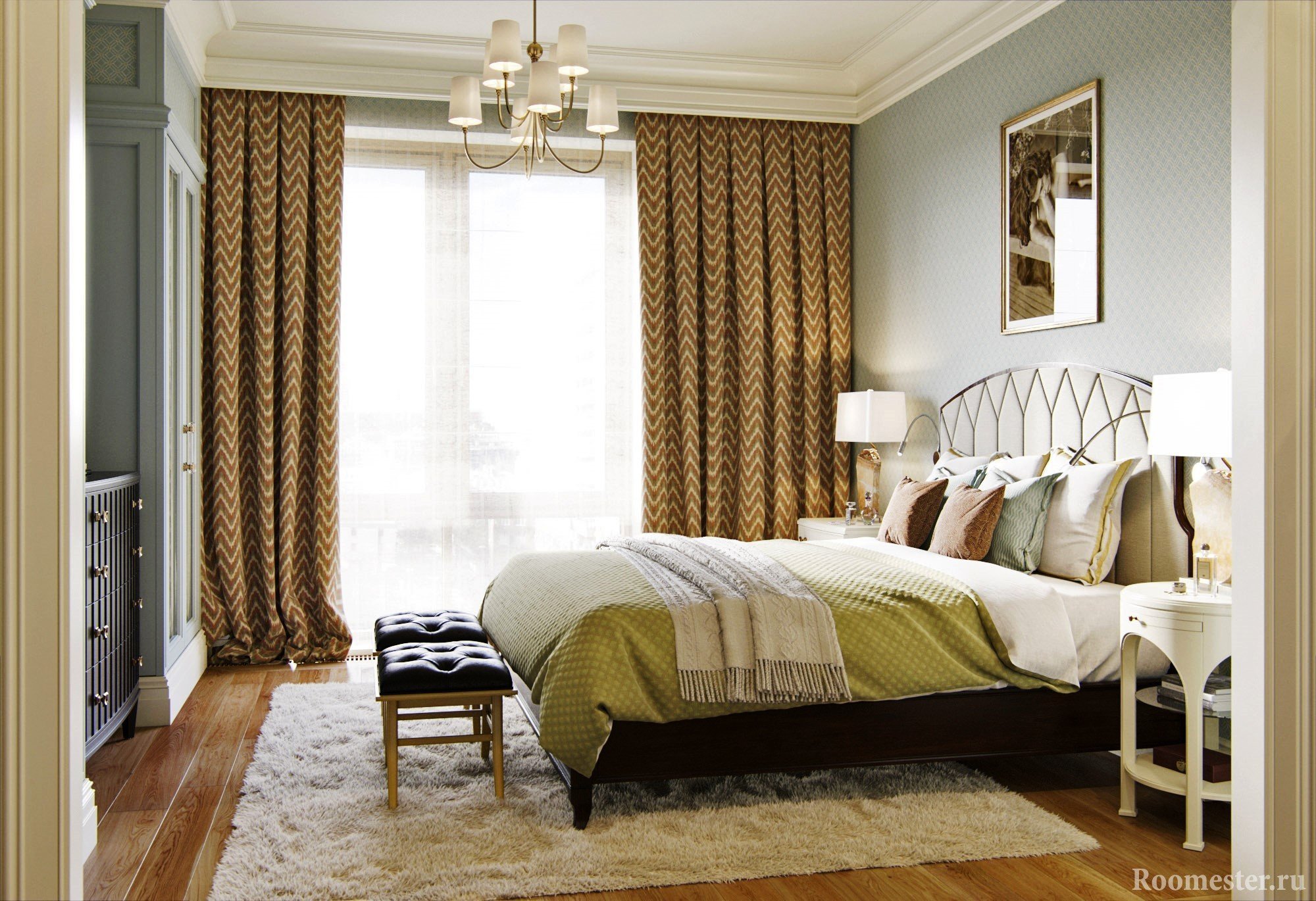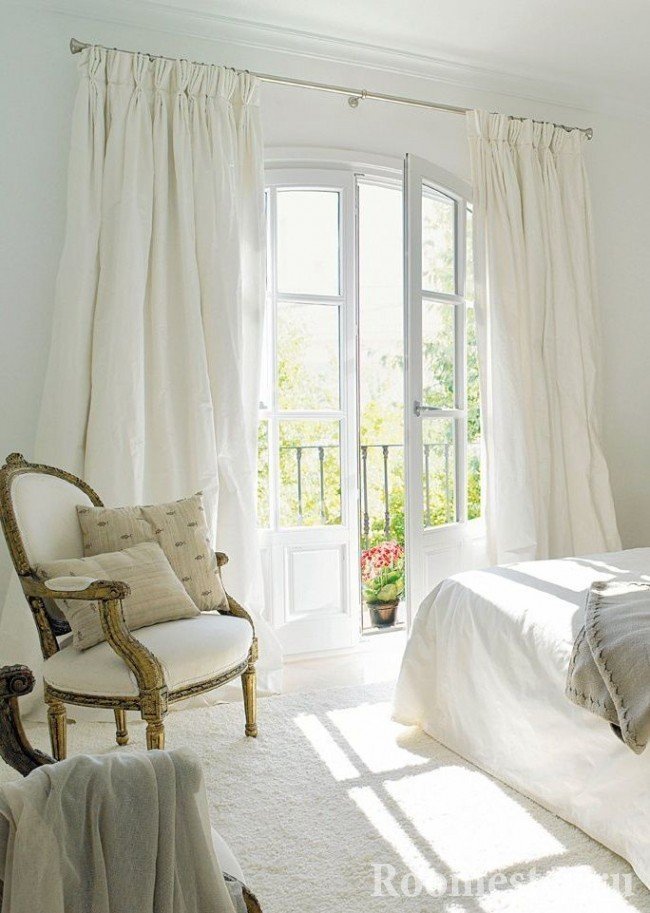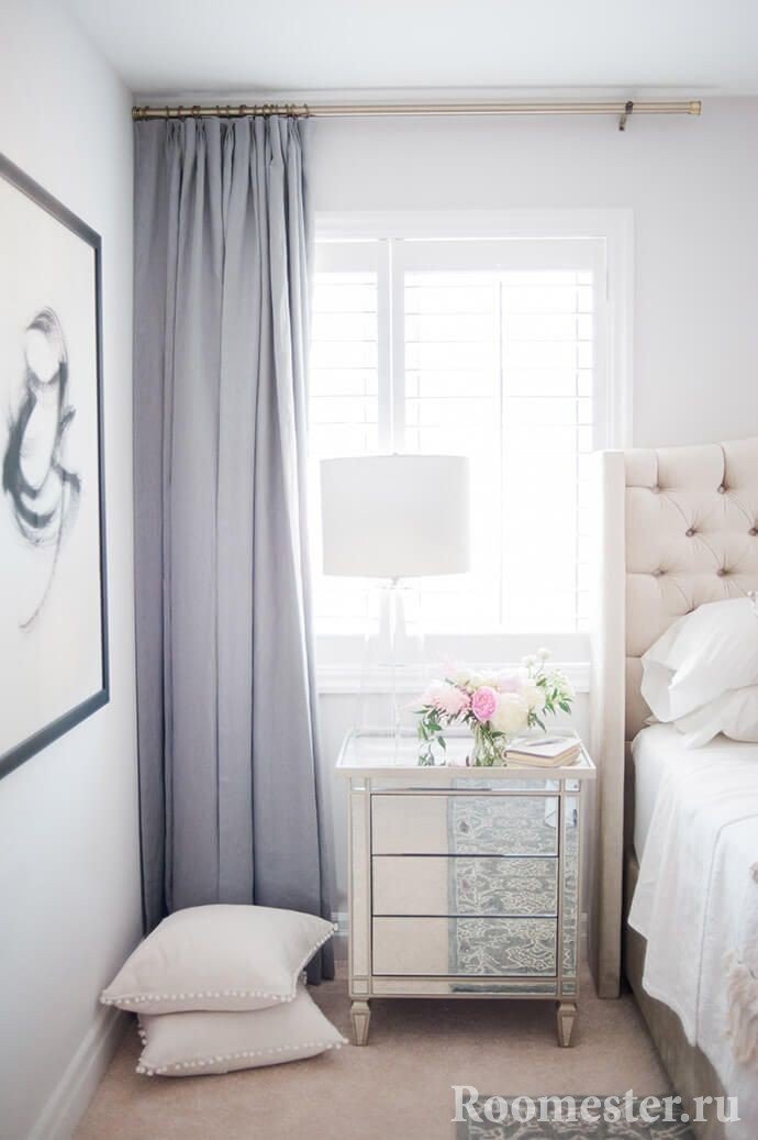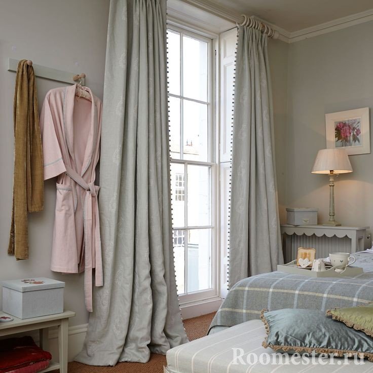 Deje un pequeño margen para que las cortinas de la ventana descansen maravillosamente en el piso, 5-10 cm, una de las soluciones más populares para el dormitorio, que a menudo se encuentra en las fotos presentadas. Criterios de rendimiento estético y elegante: