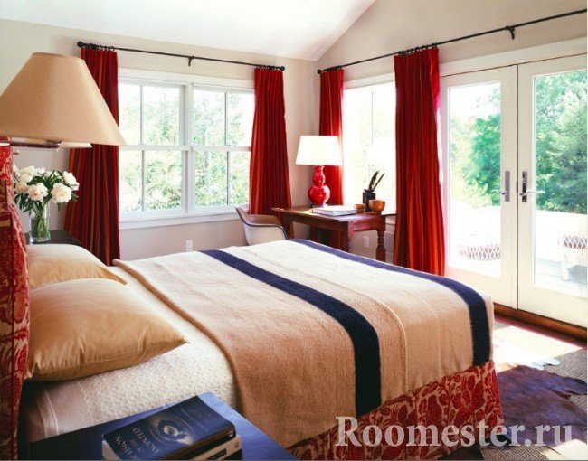 Para el dormitorio, los materiales naturales son casi un requisito previo. Solo hacer una elección se basa en la iluminación de la habitación, especialmente en las telas que tienen una textura suave: